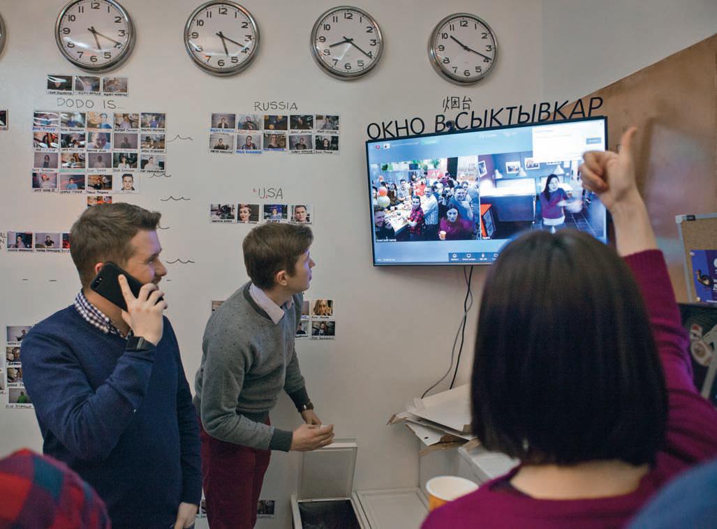 На кухне московского «Додо»-офиса висит большой экран с камерой, разделенный на две части. Левая, как зеркало, полностью охватывает кухню, правая — окно в Сыктывкар, в такую же кухню, только в тысяче километров отсюда. Завариваешь чай и машешь рукой кому-нибудь по ту сторону, а вечером, когда вся московская команда соберется за одним столом, кто-то и вовсе попросит сыктывкарского коллегу: «Дима, танцуй!».