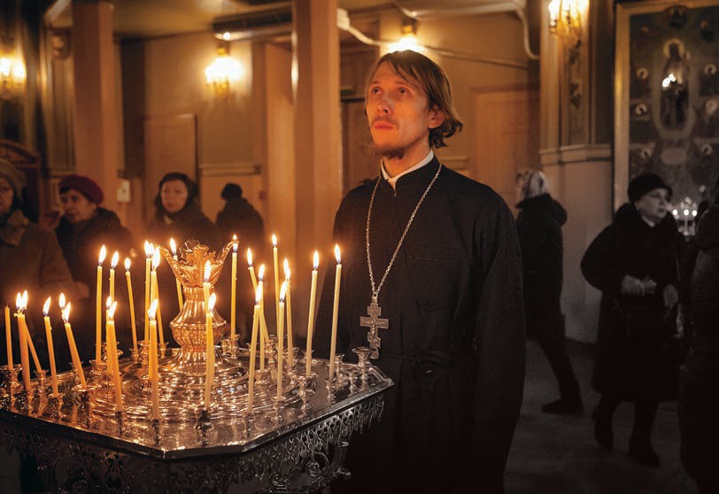 Священник Алексей Голубев целует стекло, закрывающее мощи святой Матроны, — просит благословения для предстоящего интервью, чтобы не пошло оно во вред его душе, душе читателя и Покровскому монастырю, в котором отец Алексий служит.