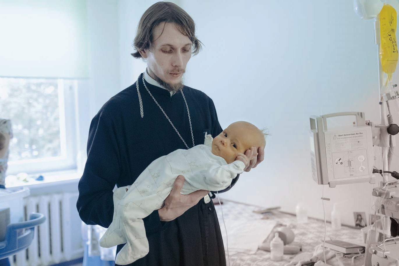 Отец Алексий порывисто встает. Берет ребенка на руки. Ходит с ним по короткому узкому проходу. Молодая мать укачивает свою двухмесячную девочку, и какое-то время в палате слышны кряхтенье младенцев и женский голос, тихо бормочущий колыбельные звуки.