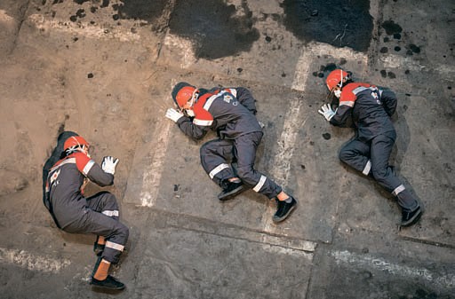 -Утверждааааю….Инструкцияяя – вокалисты в халатах и касках, таких же, которые зрители получали на входе в Мартеновский цех Выксунского металлургического завода, исполняют партитуру, написанную композитором Алексеем Сысоевым. За их спинами на светлых пластинах проецируются лица заводчан.