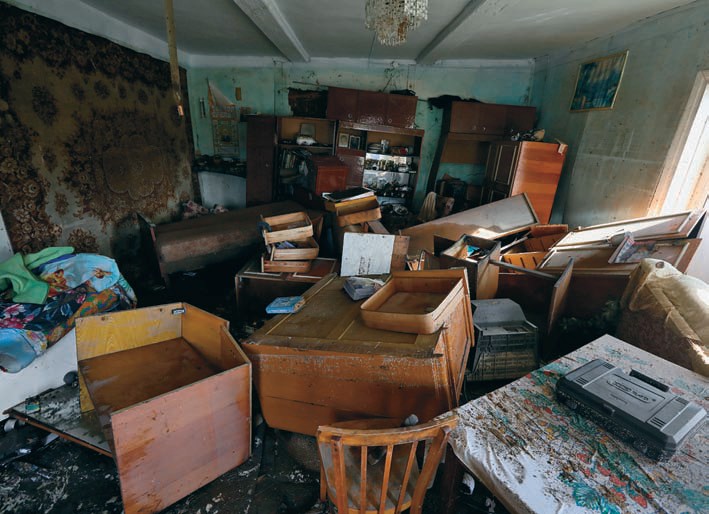 В черном двухэтажном деревянном доме выдавлены окна и двери. У входа, закрытого сверху шиферным козырьком, — нарисованный белой краской полустертый заяц. Из окон первого этажа выглядывают лоскуты обоев, вздувшаяся мебель. В окнах второго этажа стекла в покривившихся рамах почти целы. Из открытого окна выносится на сквозняке когда-то белая, но замоченная в черном иле занавеска.
