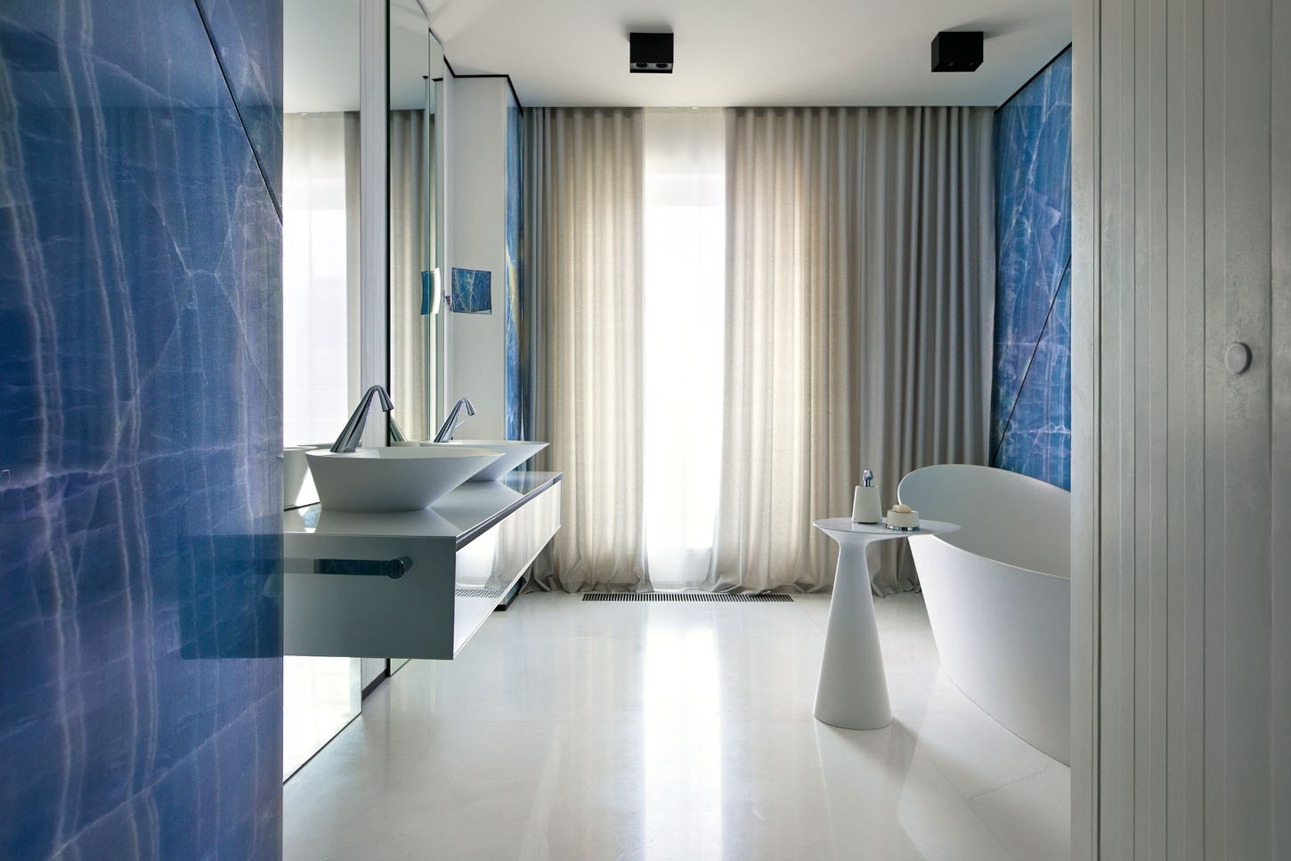 Для концептуального интерьера, где главную роль играл цвет, ванную решено было сделать голубой. Её стены выложены ониксом с белыми прожилками, в нём присутствуют нужные нам оттенки и природный рисунок. Огромные слэбы разрезали, а швы в камне декорировали тонкими чёрными вставками из металла. Этот вынужденный приём стал выразительным элементом дизайна».