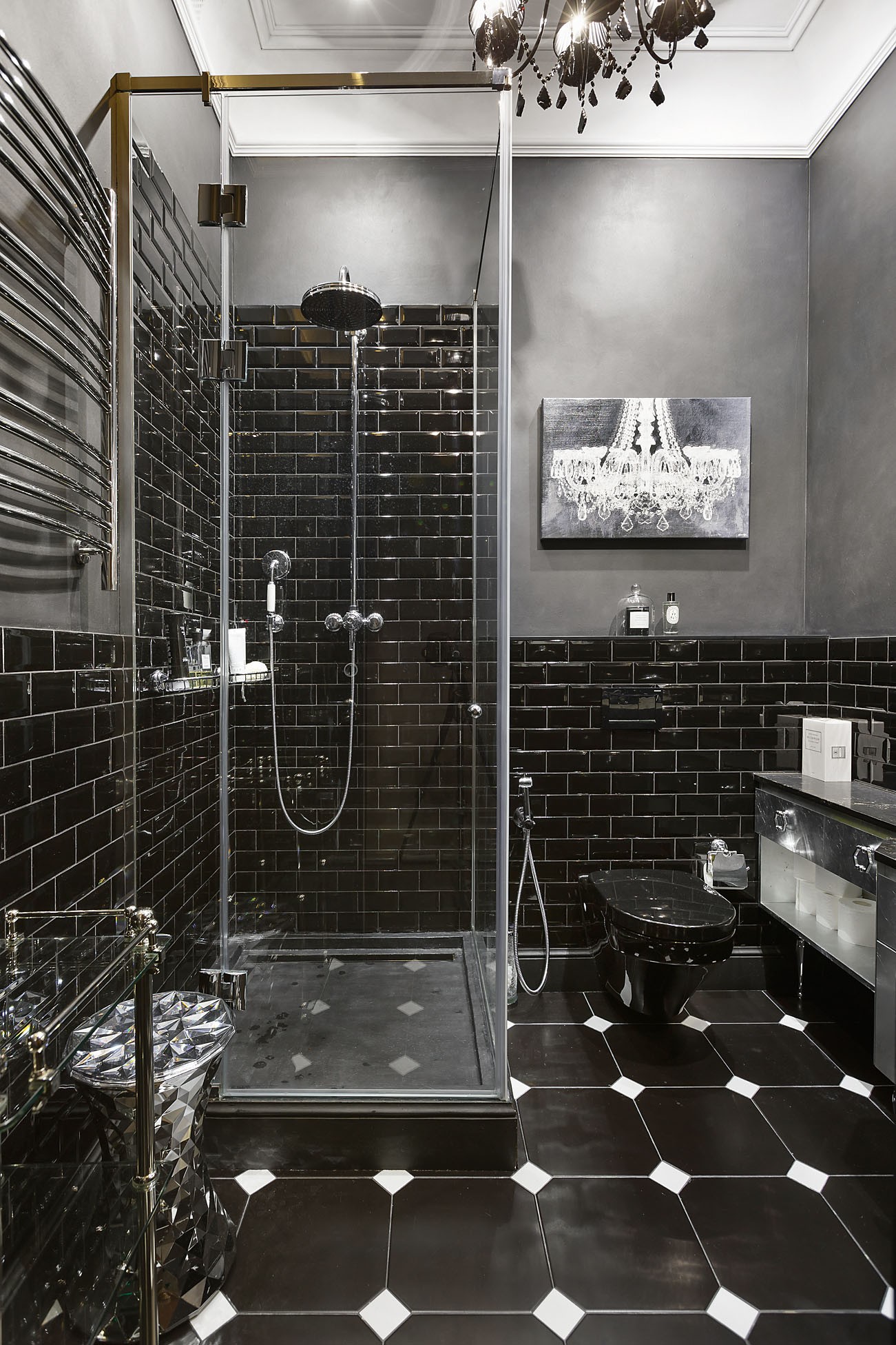 Архитектор Татьяна Хорошева: Это интерьер мужской ванной комнаты при тренажёрном зале. Нам хотелось чуть снизить брутальность помещения и показать, что не нужно относиться слишком серьёзно ко всему, что вас окружает. Поэтому стены из чёрного мрамора украсили ироничные картины голландца Саши Гольдбергера с героями комиксов, выполненных в духе фламандской живописи XVI века. Пол выложен мраморной мозаикой с 3D–эффектом».