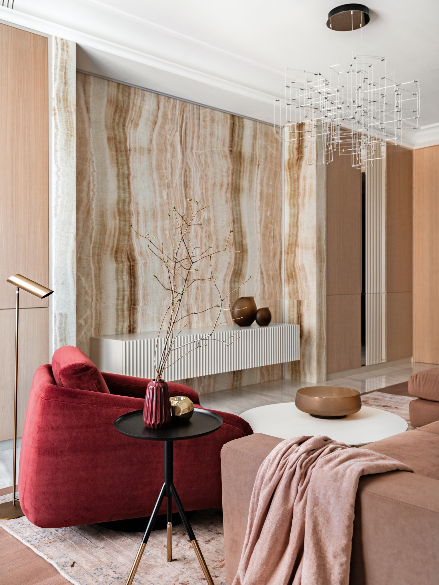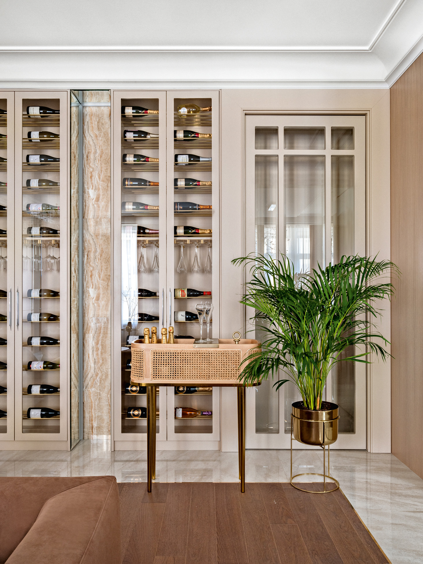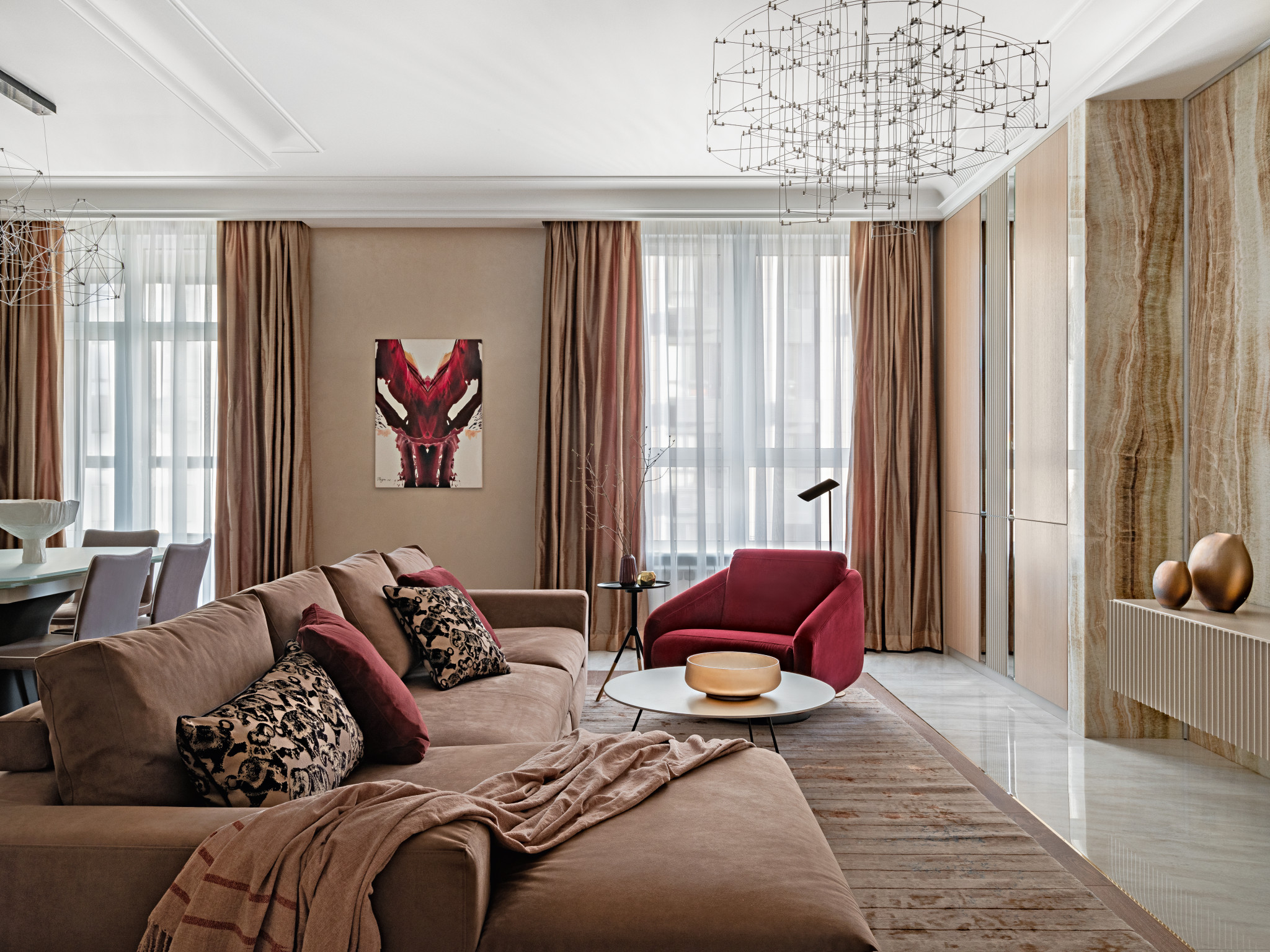 Хозяева — большие ценители вина, что нашло отражение в интерьере. В гостиной появилась винотека (ей отведено одно из центральных мест), а в оформлении использован глубокий винный оттенок. Уютное кресло и мягкие подушки бордового цвета выступают в качестве акцентных элементов. Закольцовывает композицию картина «Билатеральная симметрия №6» Татьяны Неги, выдержанная в той же цветовой гамме. Ещё один знаковый элемент — ниша из натурального оникса Ivory, ставшая настоящим украшением гостиной. В приватной зоне цветовой диапазон шире, здесь Анастасия и Игорь применили любимые хозяевами цвета. В спальне парой к основному оттенку тортора выступил пастельно–бирюзовый, привнёсший свежие нотки тропиков. В спальне дочери доминирует пыльно–розовый цвет, который в сочетании с жемчужным рисунком обоев ручной работы и серым оттенком стен выглядит ещё более изысканным. Для комнаты сына выбрали уверенный серо–бежевый цвет.
