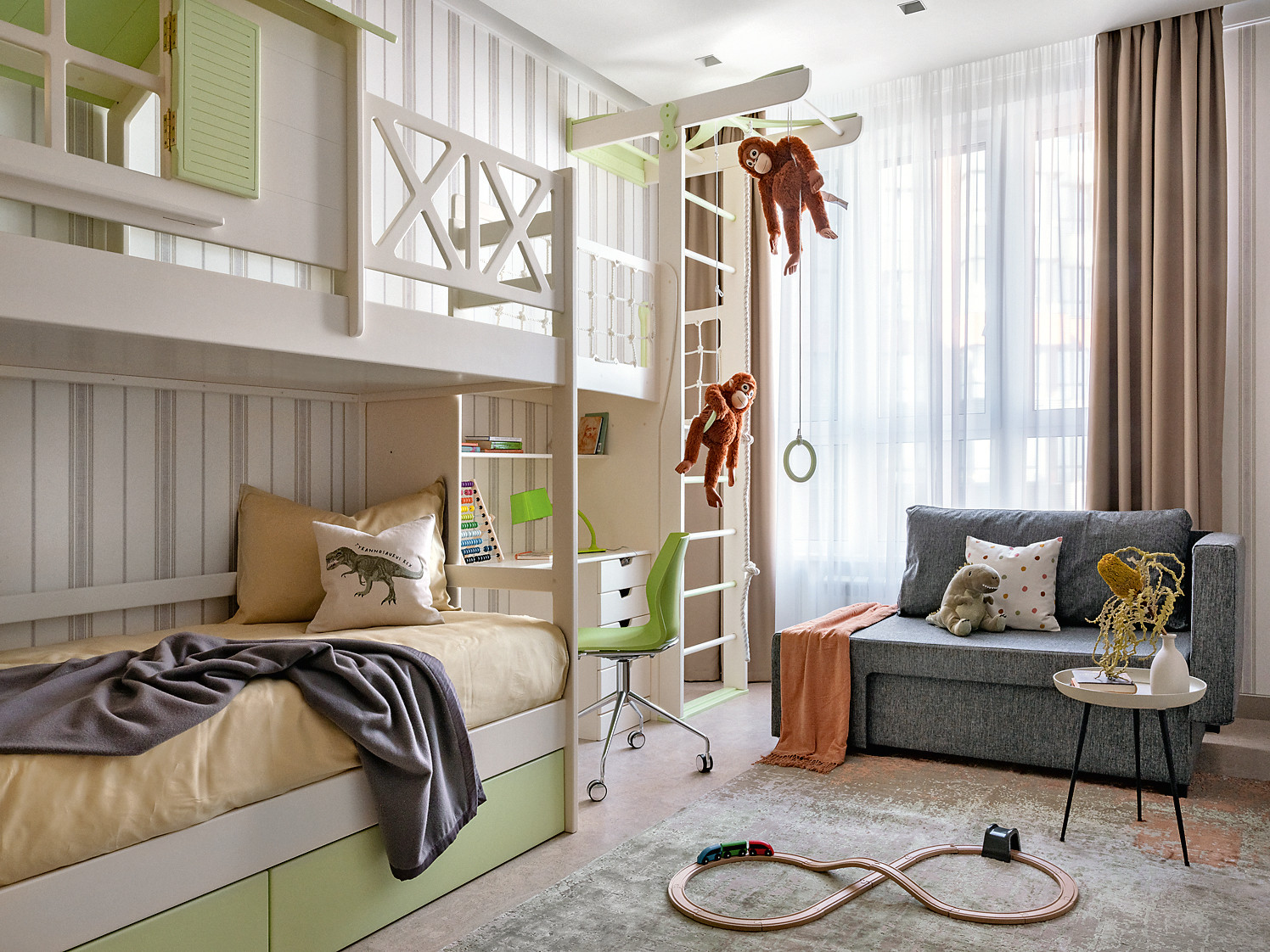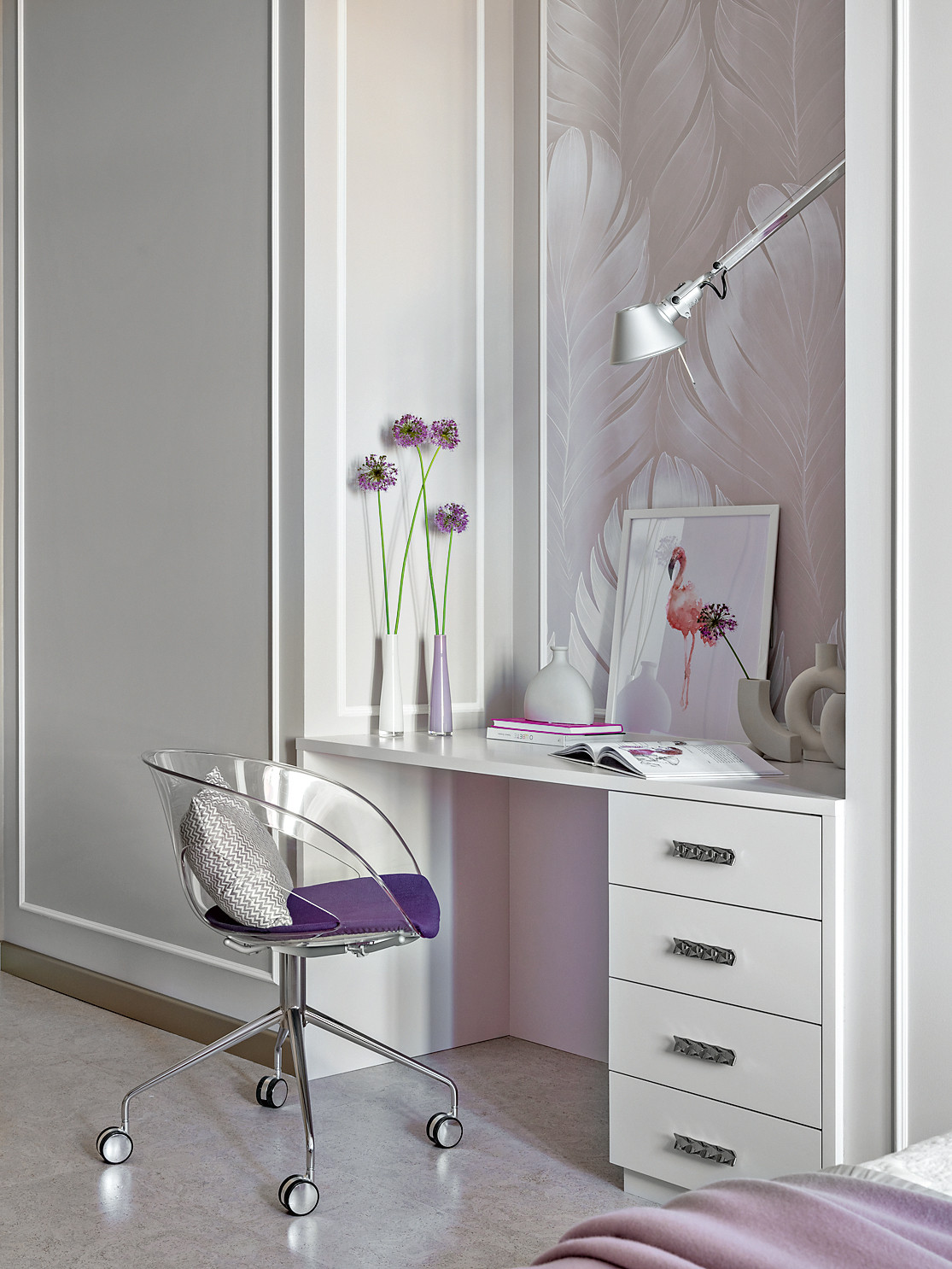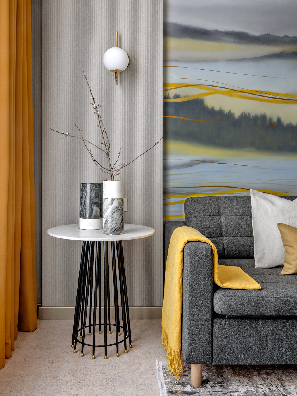 Хозяева — большие ценители вина, что нашло отражение в интерьере. В гостиной появилась винотека (ей отведено одно из центральных мест), а в оформлении использован глубокий винный оттенок. Уютное кресло и мягкие подушки бордового цвета выступают в качестве акцентных элементов. Закольцовывает композицию картина «Билатеральная симметрия №6» Татьяны Неги, выдержанная в той же цветовой гамме. Ещё один знаковый элемент — ниша из натурального оникса Ivory, ставшая настоящим украшением гостиной. В приватной зоне цветовой диапазон шире, здесь Анастасия и Игорь применили любимые хозяевами цвета. В спальне парой к основному оттенку тортора выступил пастельно–бирюзовый, привнёсший свежие нотки тропиков. В спальне дочери доминирует пыльно–розовый цвет, который в сочетании с жемчужным рисунком обоев ручной работы и серым оттенком стен выглядит ещё более изысканным. Для комнаты сына выбрали уверенный серо–бежевый цвет.