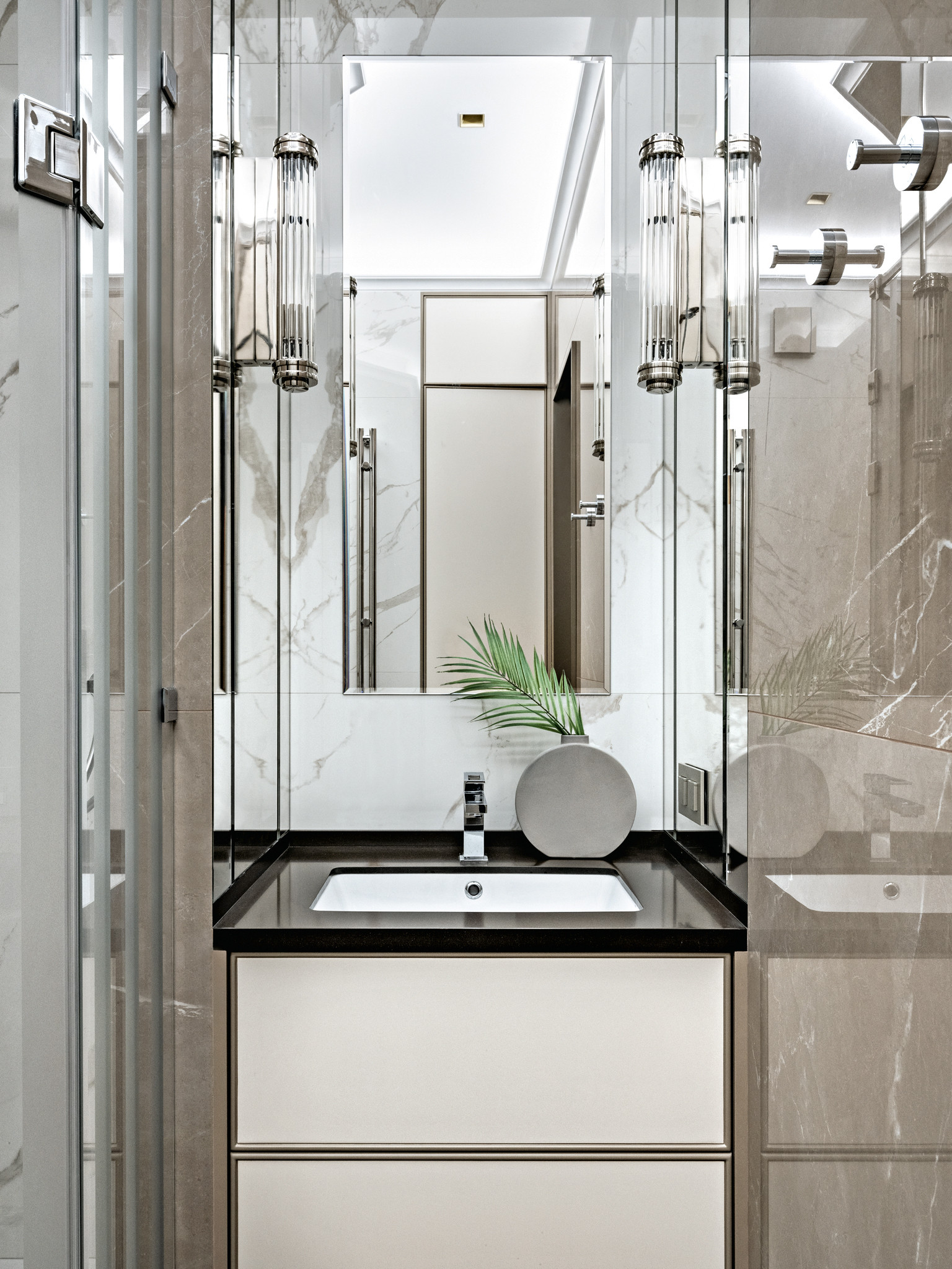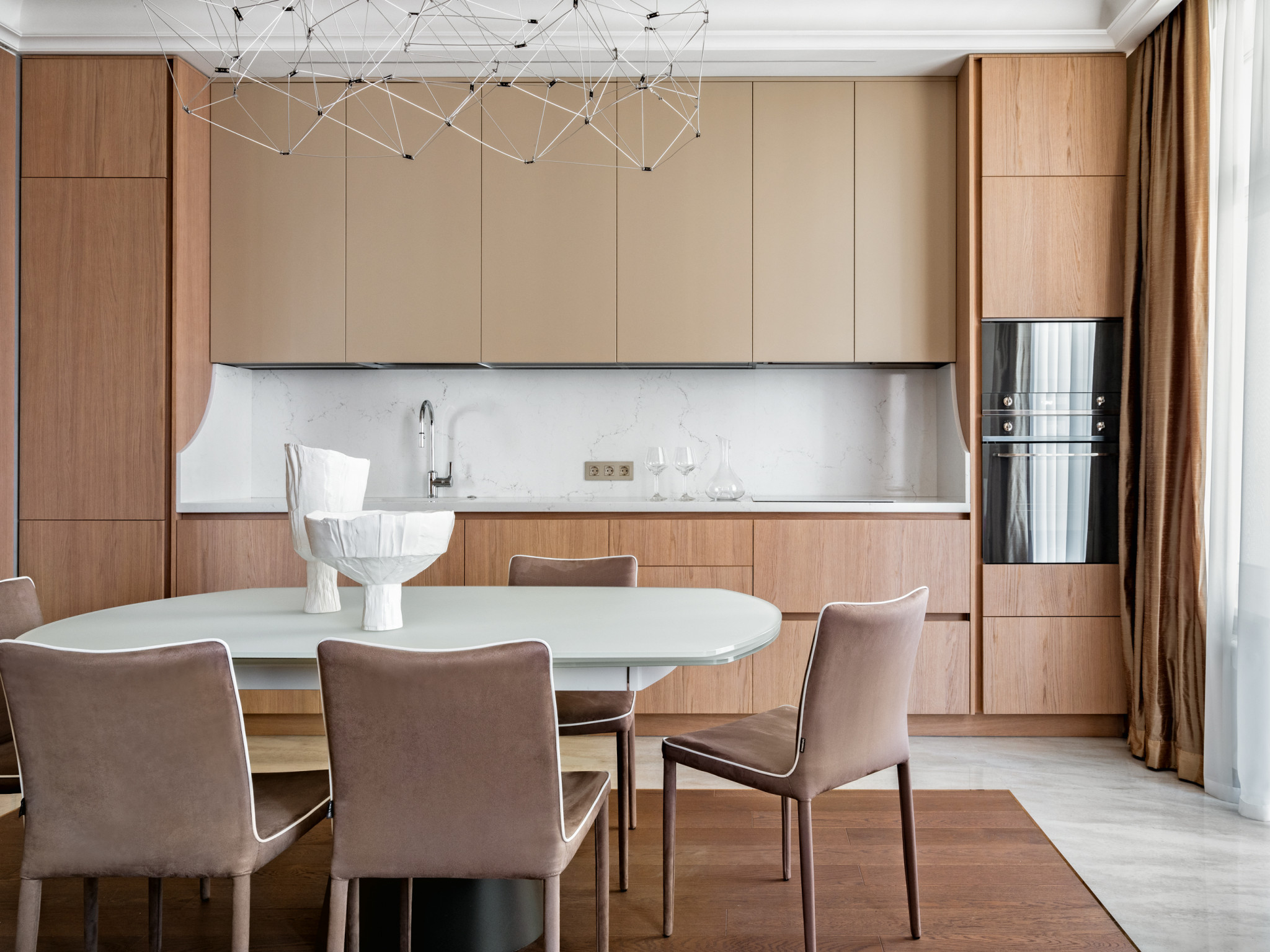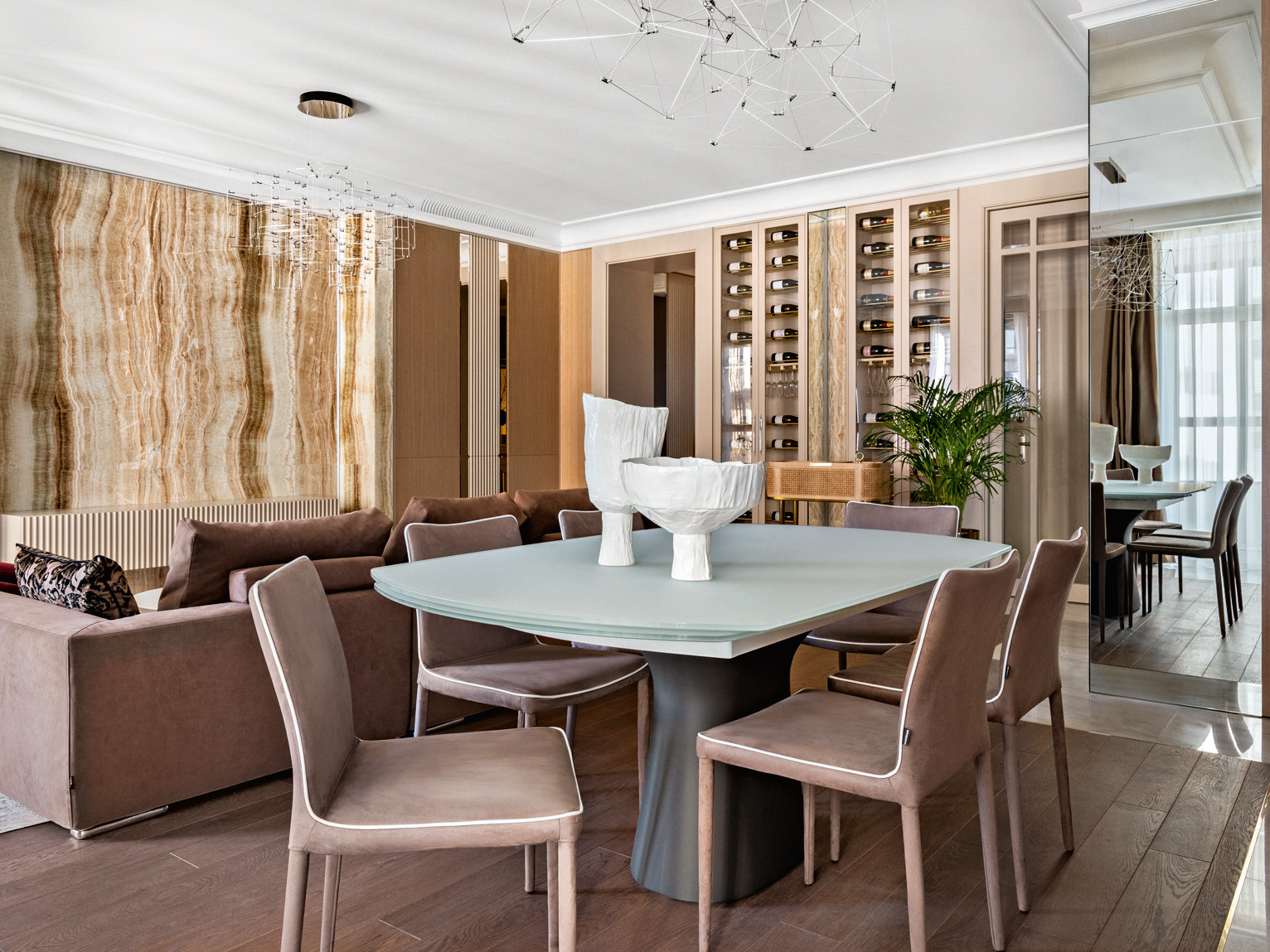 Чтобы смягчить современный характер пространства, использовали приёмы, характерные для классических стилей и ар–деко. Так, карнизы, зеркальные панели, натуральный камень, благородные ткани присущи классическим интерьерам, а строгая геометрия, обтекаемые изгибы мебели, гладкость и сияние оникса, портьеры из дикого шёлка и экзотические мотивы напоминают об эпохе роскоши. Но все эти элементы гармонично сочетаются и дополняют друг друга, интерьер не выглядит перегруженным. Благодаря правильному балансу, умеренности в сочетании с натуральными материалами он будет оставаться актуальным долгие годы. «Мы постарались создать универсальную жилую среду для мегаполиса, современную и одновременно уютную, — замечает Игорь Ситкилов. — Что важно: все предметы обстановки — европейских фабрик, только оригиналы, никаких копий и реплик. Мы придерживаемся этого принципа во всех своих проектах. В этом смысле, пожалуй, самый заметный предмет здесь — невесомые люстры фабрики QUASAR, форма которых стилизована под классическую, но в современном исполнении. Их образ ещё раз напоминает о том, что в этом интерьере за основу взяты классические приёмы».