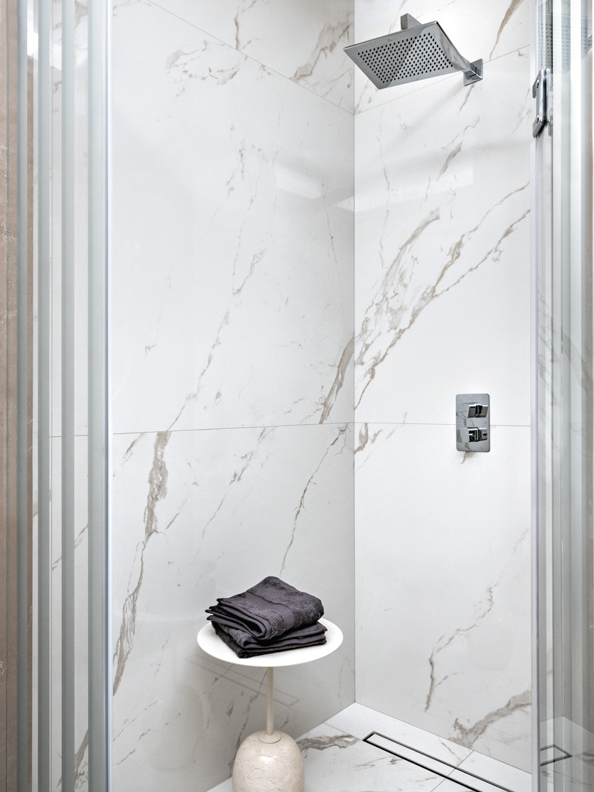 Хозяева — молодая семейная пара с двумя детьми — приобрели две квартиры и поставили перед дизайнерами задачу создать комфортное пространство с большой общественной зоной для приёма родных и друзей. Гостиную с кухней владельцы планировали обустроить на месте маленькой квартиры, из окон которой открывается вид на набережную Москвы–реки. Дизайнеры всецело поддержали это решение, оно было самым логичным. Но при этом вход в гостиную получался неудобным, впритык к входу в квартиру. Поэтому основным сделали второй вход (со стороны большой квартиры), а «запасной» скрыли, задекорировав его порталом с витражной дверью. Благодаря объединению квартир удалось разделить объём на два отдельных, самостоятельных блока. «Во всех своих проектах мы всегда стараемся максимально развести общую зону и приватную, чтобы они не пересекались. Это наш главный критерий при создании планировочного решения, особенно когда речь идёт о семье с детьми. Эта квартира не стала исключением», — поясняет решение Анастасия Ламидова.