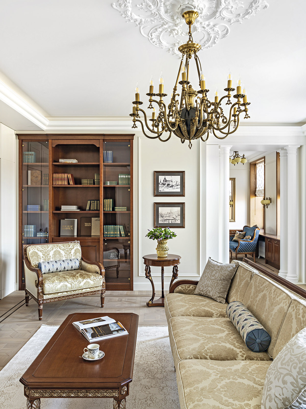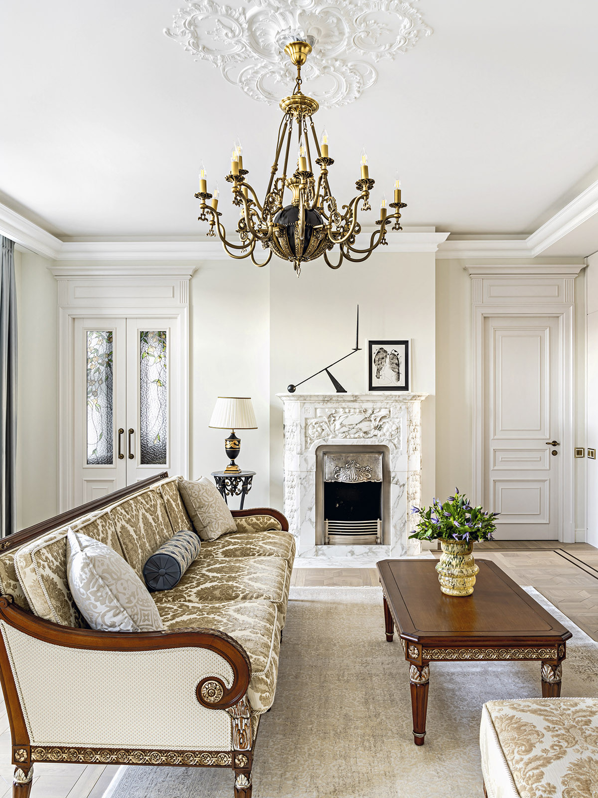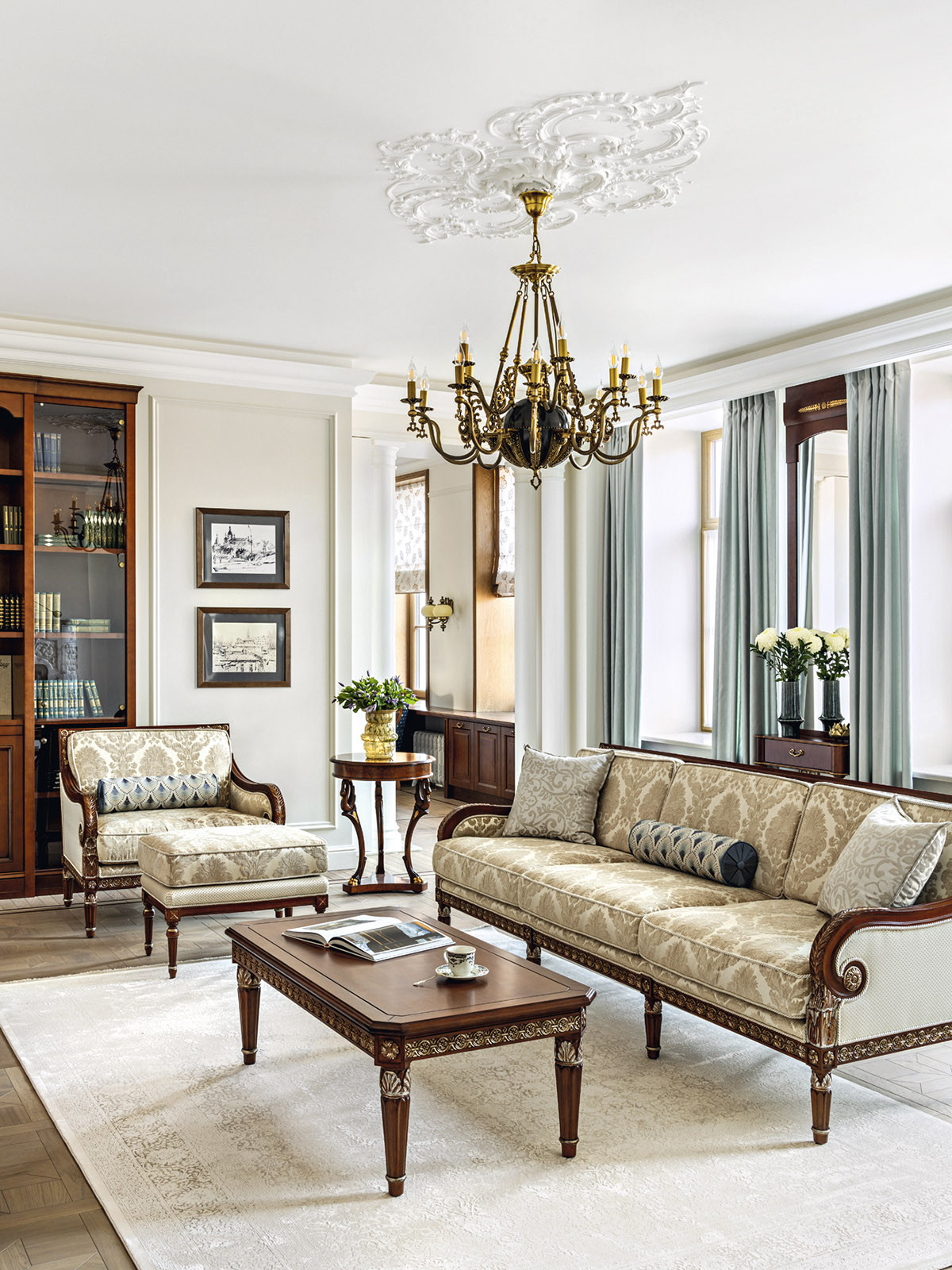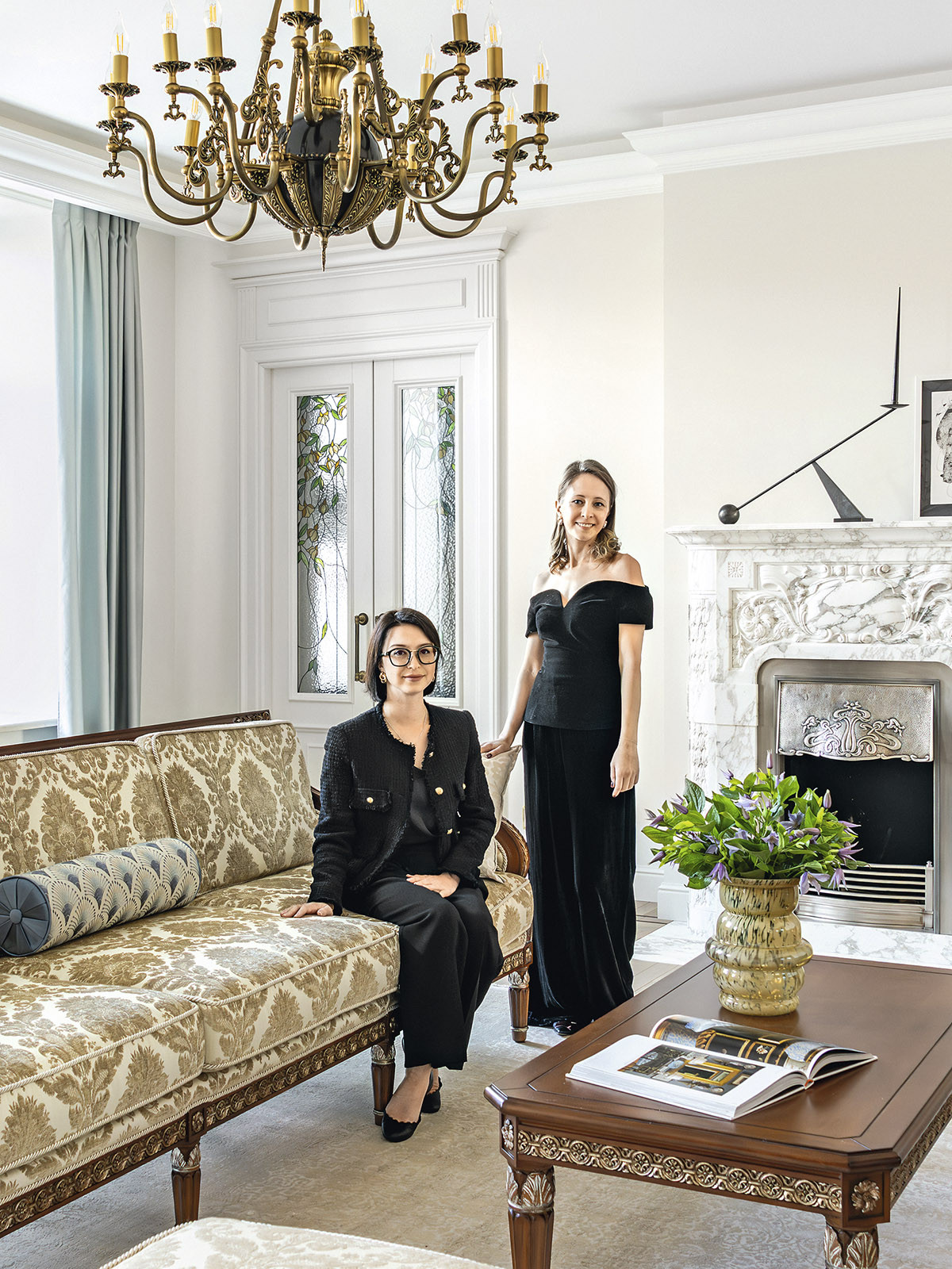 Образ интерьера — сдержанный, деликатный, без излишней пышности, блеска и золота. Это красивое и утонченное пространство вне времени. Оно не привязано к сиюминутным трендам и модным тенденциям, поэтому будет актуально многие годы. «В сравнении с минимализмом и многими другими стилями, классика, конечно, более нарядная. Но в классицизме есть строгость, линейность и сдержанность. Поэтому именно этот стиль взят за основу, а дальше нанизывались, как бусины, детали в виде витражных дверей в духе ар-нуво в кухню и ванную. В интерьере много вплетений из других эпох и направлений, которые позволяют из - бежать стилистической монотонности», — добавляет соавтор проекта Ксения Леон. «Каждый проект создается с учетом индивидуальных пожеланий заказчиков — это основной ориентир. Для нас важна не только эстетика, но и функциональность», — подчеркивает Ксения. «Изящество линий пре - обладает над декором, а функциональные элементы, например, скрытый шкаф в гостиной в зоне портала с колоннами, деликатно вписаны в архитектурный ансамбль». У заказчиков часто гостит девятилетний внук. Поэтому особое внимание уделили созданию детской комнаты. «Детская — дань творчеству Казимира Малевича. Цветовые блоки на стенах отсылают к палитре супрематизма, а мобильная сцена с театральным светом позволяет разыгрывать кукольные спектакли. Спальное место скрыто под подиумом, превращая комнату в мини-театр», — дополняет Александра. Центральным элементом гостиной стал камин из итальянского мрамора — реплика работы Фёдора Лидваля, выполненная мастерами «Камины Петербурга». Столярные изделия — двери, встроенные шкафы, консоли с зеркалами, часть тумб и буфет — созданы петербургскими специалистами компании «СТЭК» по эскизам авторов. «Каждая деталь, будь то витражные двери или «двери-стеллажи», тщательно продумана. Каждое решение гармонично вписалось в общий стиль квартиры и подчеркнуло ее уникальность», — рассказывает Александра. Перепланировка вернула апартаментам монументальность: анфиладная структура наполнила прихожую и гостиную светом и воздухом. Санузлы расширили за счет коридора, вход в приватную зону организовали из гостиной, а кабинет и библиотеку скрыли за панелями с эффектом старинного зеркала. Большое количество книг нашли свое место в новой двухъярусной библиотеке. Для создания второго яруса вдохновением послужила библиотека Николая II в Эрмитаже. «И хотя стилистически она спроектирована совершенно иначе, именно оттуда мы почерпнули идею планировочного устройства, — поясняет Александра. — Через замаскированную под фасад шкафа дверь, можно попасть в зону кладовой. Тут нашлось место и для лыж, и для большого количества чемоданов, и для сезонного хранения одежды, а также располагается красивая витрина для хранения коллекции сумок. Каждый сантиметр кладовой продуман до мелочей». «Мы заметили, что в условиях динамичного мира люди все чаще обращаются к традиционным стилям, — размышляет Ксения. — Это закономерно: в эпоху перемен человек ищет опору в привычном, в наследии прошлого. И классика становится необходимым якорем стабильности. Но и заказчики, и мы понимаем, что живем в современном мире, поэтому интерьер не мыслим без современных технологий. Живя в большом городе, люди хотят дышать свежим воздухом, отдыхать в тишине, видеть вокр