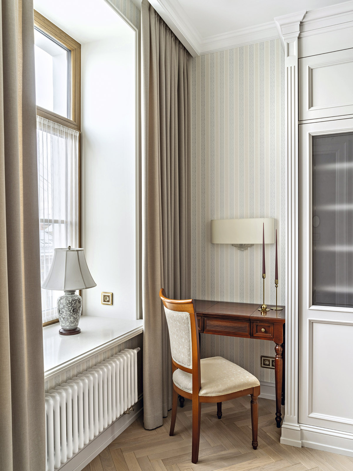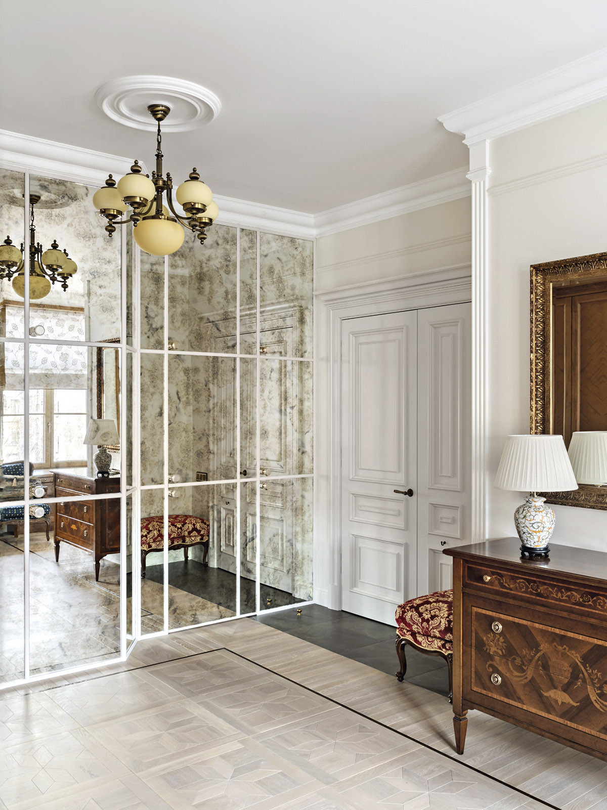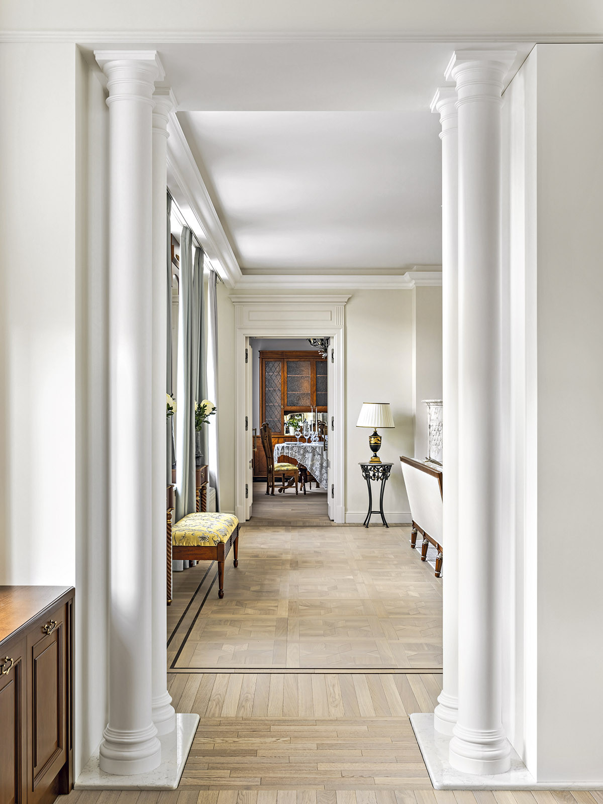 Образ интерьера — сдержанный, деликатный, без излишней пышности, блеска и золота. Это красивое и утонченное пространство вне времени. Оно не привязано к сиюминутным трендам и модным тенденциям, поэтому будет актуально многие годы. «В сравнении с минимализмом и многими другими стилями, классика, конечно, более нарядная. Но в классицизме есть строгость, линейность и сдержанность. Поэтому именно этот стиль взят за основу, а дальше нанизывались, как бусины, детали в виде витражных дверей в духе ар-нуво в кухню и ванную. В интерьере много вплетений из других эпох и направлений, которые позволяют из - бежать стилистической монотонности», — добавляет соавтор проекта Ксения Леон. «Каждый проект создается с учетом индивидуальных пожеланий заказчиков — это основной ориентир. Для нас важна не только эстетика, но и функциональность», — подчеркивает Ксения. «Изящество линий пре - обладает над декором, а функциональные элементы, например, скрытый шкаф в гостиной в зоне портала с колоннами, деликатно вписаны в архитектурный ансамбль». У заказчиков часто гостит девятилетний внук. Поэтому особое внимание уделили созданию детской комнаты. «Детская — дань творчеству Казимира Малевича. Цветовые блоки на стенах отсылают к палитре супрематизма, а мобильная сцена с театральным светом позволяет разыгрывать кукольные спектакли. Спальное место скрыто под подиумом, превращая комнату в мини-театр», — дополняет Александра. Центральным элементом гостиной стал камин из итальянского мрамора — реплика работы Фёдора Лидваля, выполненная мастерами «Камины Петербурга». Столярные изделия — двери, встроенные шкафы, консоли с зеркалами, часть тумб и буфет — созданы петербургскими специалистами компании «СТЭК» по эскизам авторов. «Каждая деталь, будь то витражные двери или «двери-стеллажи», тщательно продумана. Каждое решение гармонично вписалось в общий стиль квартиры и подчеркнуло ее уникальность», — рассказывает Александра. Перепланировка вернула апартаментам монументальность: анфиладная структура наполнила прихожую и гостиную светом и воздухом. Санузлы расширили за счет коридора, вход в приватную зону организовали из гостиной, а кабинет и библиотеку скрыли за панелями с эффектом старинного зеркала. Большое количество книг нашли свое место в новой двухъярусной библиотеке. Для создания второго яруса вдохновением послужила библиотека Николая II в Эрмитаже. «И хотя стилистически она спроектирована совершенно иначе, именно оттуда мы почерпнули идею планировочного устройства, — поясняет Александра. — Через замаскированную под фасад шкафа дверь, можно попасть в зону кладовой. Тут нашлось место и для лыж, и для большого количества чемоданов, и для сезонного хранения одежды, а также располагается красивая витрина для хранения коллекции сумок. Каждый сантиметр кладовой продуман до мелочей». «Мы заметили, что в условиях динамичного мира люди все чаще обращаются к традиционным стилям, — размышляет Ксения. — Это закономерно: в эпоху перемен человек ищет опору в привычном, в наследии прошлого. И классика становится необходимым якорем стабильности. Но и заказчики, и мы понимаем, что живем в современном мире, поэтому интерьер не мыслим без современных технологий. Живя в большом городе, люди хотят дышать свежим воздухом, отдыхать в тишине, видеть вокр