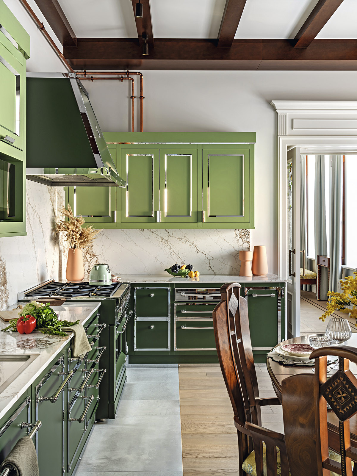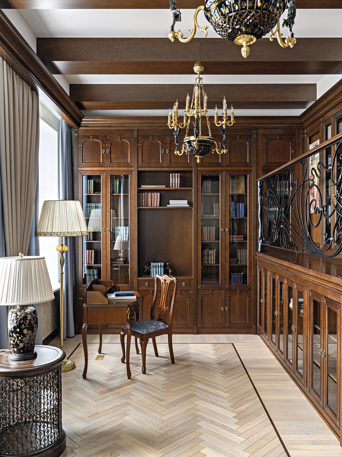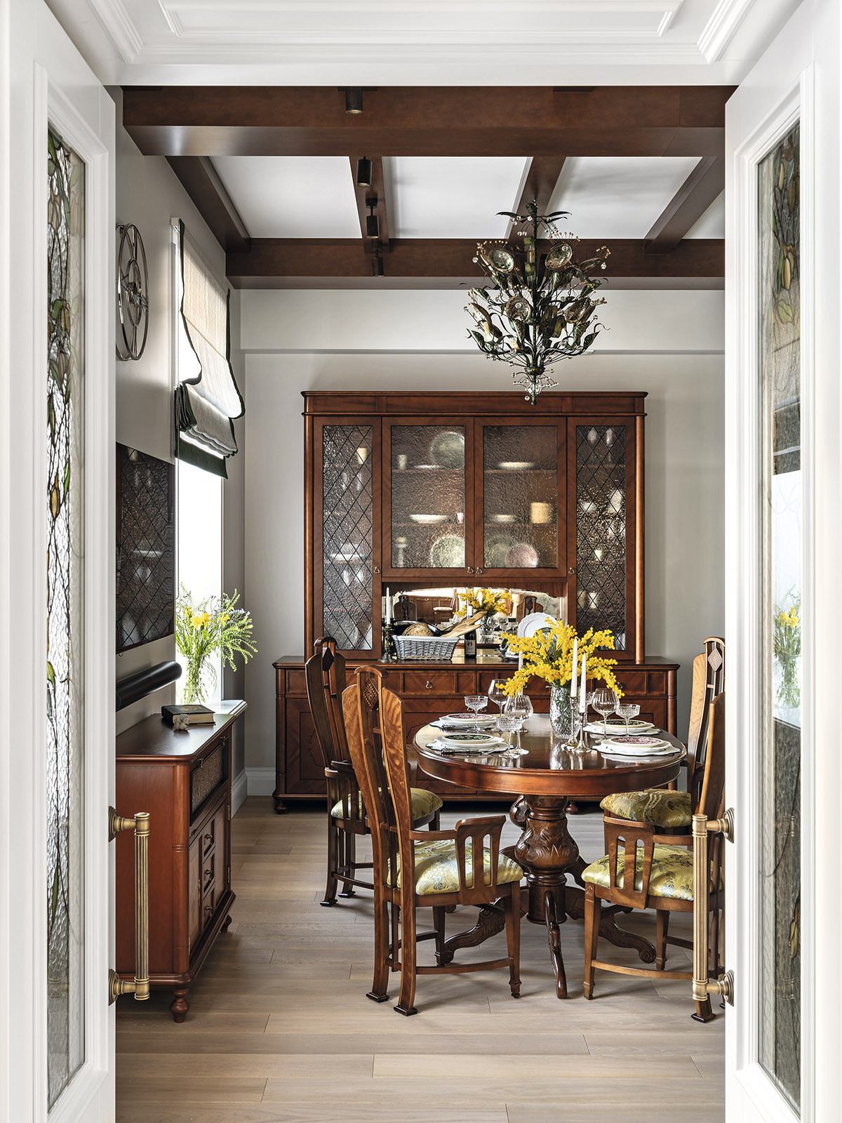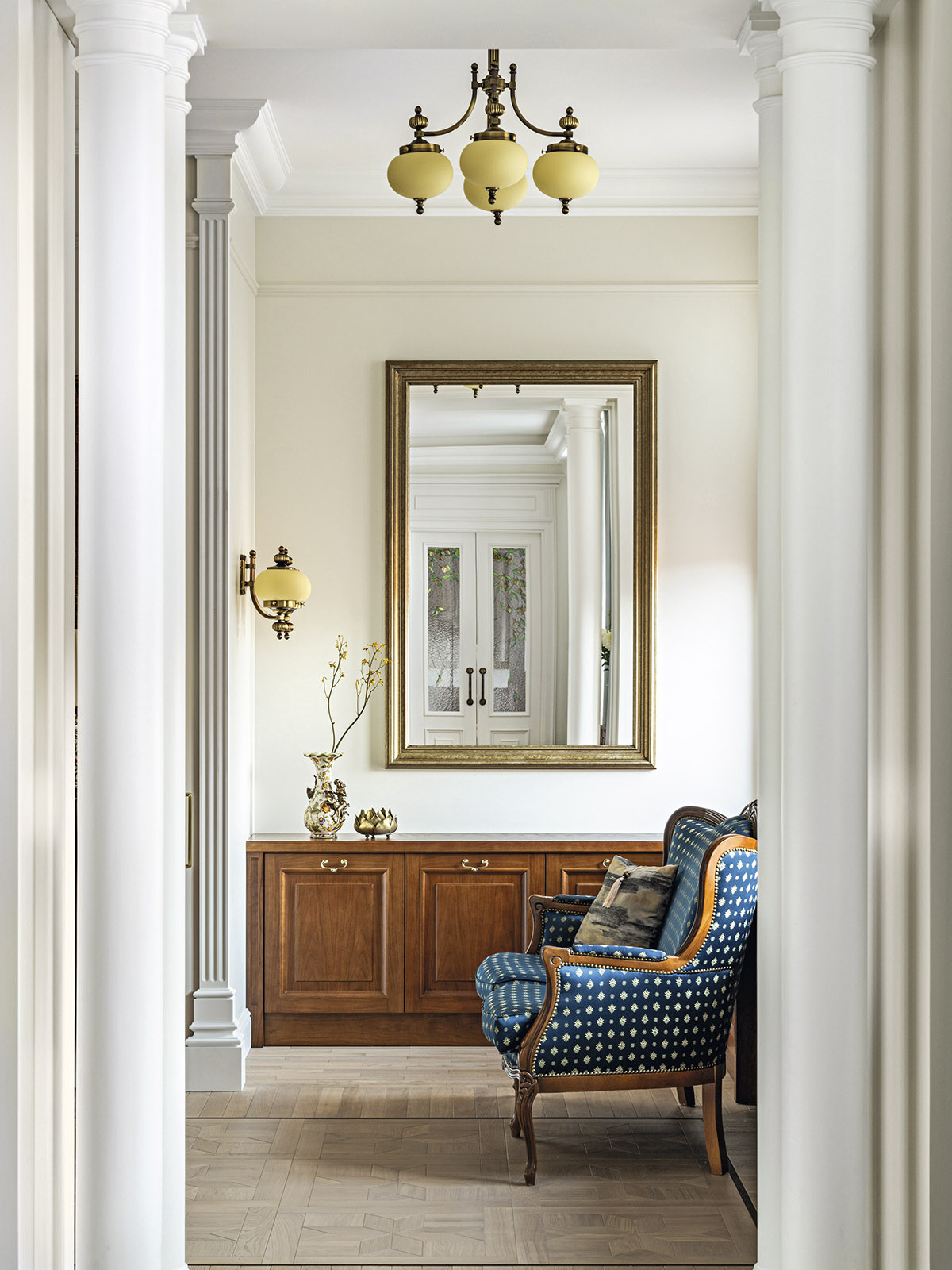 Образ интерьера — сдержанный, деликатный, без излишней пышности, блеска и золота. Это красивое и утонченное пространство вне времени. Оно не привязано к сиюминутным трендам и модным тенденциям, поэтому будет актуально многие годы. «В сравнении с минимализмом и многими другими стилями, классика, конечно, более нарядная. Но в классицизме есть строгость, линейность и сдержанность. Поэтому именно этот стиль взят за основу, а дальше нанизывались, как бусины, детали в виде витражных дверей в духе ар-нуво в кухню и ванную. В интерьере много вплетений из других эпох и направлений, которые позволяют из - бежать стилистической монотонности», — добавляет соавтор проекта Ксения Леон. «Каждый проект создается с учетом индивидуальных пожеланий заказчиков — это основной ориентир. Для нас важна не только эстетика, но и функциональность», — подчеркивает Ксения. «Изящество линий пре - обладает над декором, а функциональные элементы, например, скрытый шкаф в гостиной в зоне портала с колоннами, деликатно вписаны в архитектурный ансамбль». У заказчиков часто гостит девятилетний внук. Поэтому особое внимание уделили созданию детской комнаты. «Детская — дань творчеству Казимира Малевича. Цветовые блоки на стенах отсылают к палитре супрематизма, а мобильная сцена с театральным светом позволяет разыгрывать кукольные спектакли. Спальное место скрыто под подиумом, превращая комнату в мини-театр», — дополняет Александра. Центральным элементом гостиной стал камин из итальянского мрамора — реплика работы Фёдора Лидваля, выполненная мастерами «Камины Петербурга». Столярные изделия — двери, встроенные шкафы, консоли с зеркалами, часть тумб и буфет — созданы петербургскими специалистами компании «СТЭК» по эскизам авторов. «Каждая деталь, будь то витражные двери или «двери-стеллажи», тщательно продумана. Каждое решение гармонично вписалось в общий стиль квартиры и подчеркнуло ее уникальность», — рассказывает Александра. Перепланировка вернула апартаментам монументальность: анфиладная структура наполнила прихожую и гостиную светом и воздухом. Санузлы расширили за счет коридора, вход в приватную зону организовали из гостиной, а кабинет и библиотеку скрыли за панелями с эффектом старинного зеркала. Большое количество книг нашли свое место в новой двухъярусной библиотеке. Для создания второго яруса вдохновением послужила библиотека Николая II в Эрмитаже. «И хотя стилистически она спроектирована совершенно иначе, именно оттуда мы почерпнули идею планировочного устройства, — поясняет Александра. — Через замаскированную под фасад шкафа дверь, можно попасть в зону кладовой. Тут нашлось место и для лыж, и для большого количества чемоданов, и для сезонного хранения одежды, а также располагается красивая витрина для хранения коллекции сумок. Каждый сантиметр кладовой продуман до мелочей». «Мы заметили, что в условиях динамичного мира люди все чаще обращаются к традиционным стилям, — размышляет Ксения. — Это закономерно: в эпоху перемен человек ищет опору в привычном, в наследии прошлого. И классика становится необходимым якорем стабильности. Но и заказчики, и мы понимаем, что живем в современном мире, поэтому интерьер не мыслим без современных технологий. Живя в большом городе, люди хотят дышать свежим воздухом, отдыхать в тишине, видеть вокр