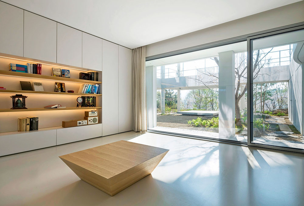 Из панорамных окон открываются виды на парк, а многие помещения имеют непосредственный выход на открытые террасы или во внутренний дворик маданг, отсылающий к национальной архитектуре. Это своеобразное сердце дома: Ким Хё-Ман превратил его в поэтичный тайный сад, место для посиделок с друзьями на открытом воздухе. Изящная веранда на тонких колоннах напоминает классическую корейскую нумару — комнату, приподнятую над уровнем земли, где хозяева наслаждались видами и принимали гостей. Это ключевой элемент проекта: с одной стороны, смотровая площадка, своеобразный «видоискатель», который обрамляет городской ландшафт, а с другой — защита от любопытных взглядов посетителей парка и ворота во внешний мир. «Наша веранда — «открытая стена», обозначающая границу дома и служащая наблюдательным пунктом, откуда можно любоваться меняющимися природными пейзажами и динамичным городским пейзажем», — рассказывает Ким Хё-Ман.