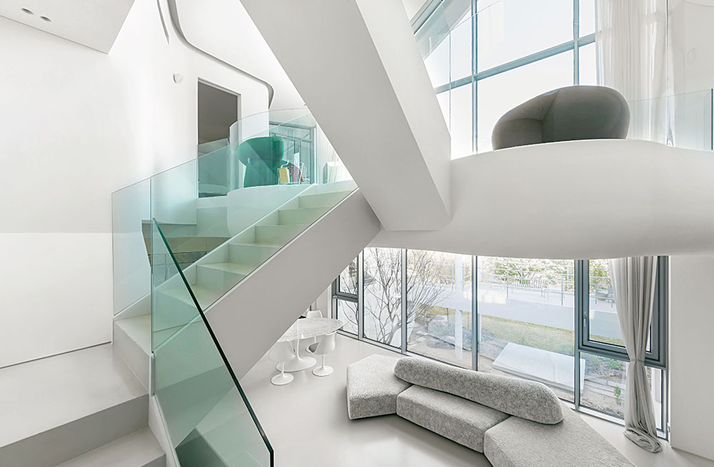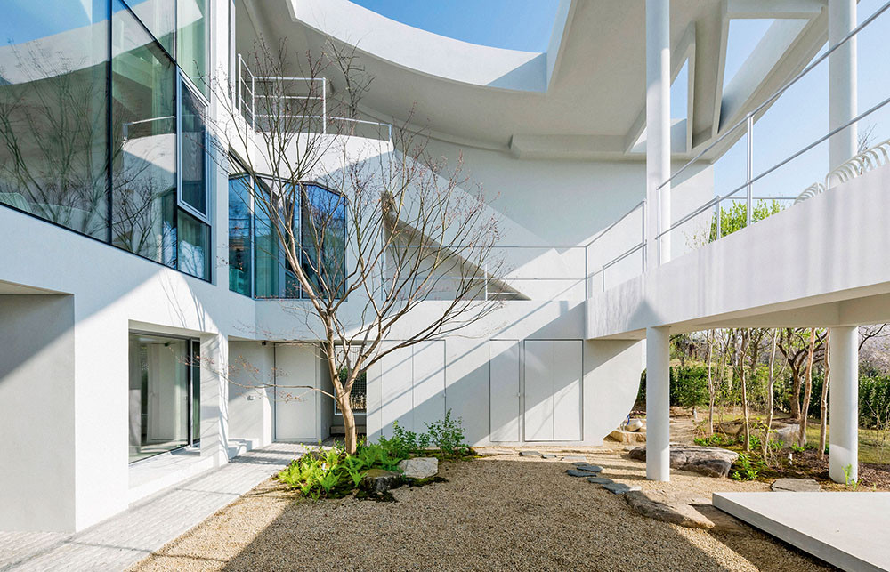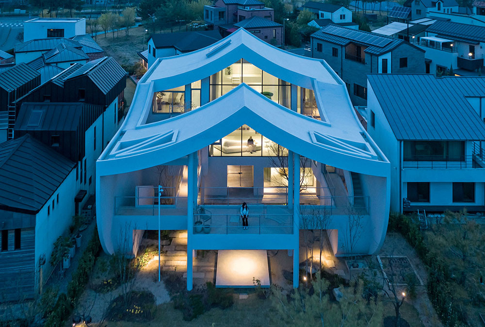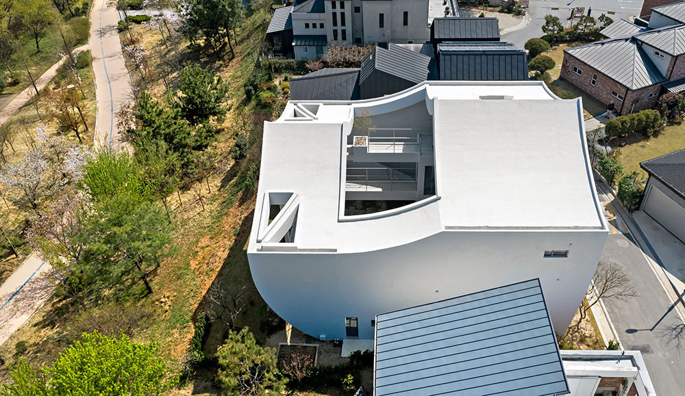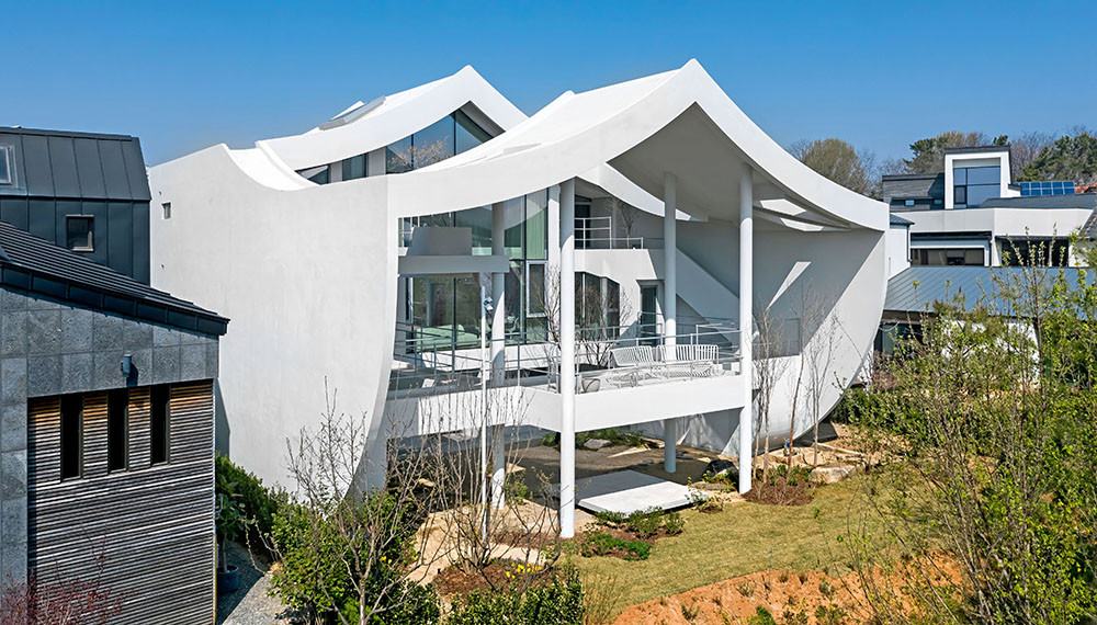 Художественный образ, которым руководствовался Ким Хё-Ман, — облако. «Название проекта — HO-UN — буквально означает «Облако над озером». Оно идеально подходит для легкого, парящего дома с невесомой крышей», — говорит автор проекта. Сам дом представляет собой сложное многоуровневое пространство — оригинальные конструктивные решения сочетаются с ощущением простора и воздуха. На трех уровнях расположились четыре спальни, большая кухня-гостиная и уединенная зона под крышей. Динамика — визитная карточка студии: мостики и переходы соединяют помещения на этажах разной высоты, а диагональные и волнистые линии задают ритм. На третьем уровне, над гостиной, архитектор расположил зону в необычной форме облака — по его задумке, здесь может собираться вся семья.