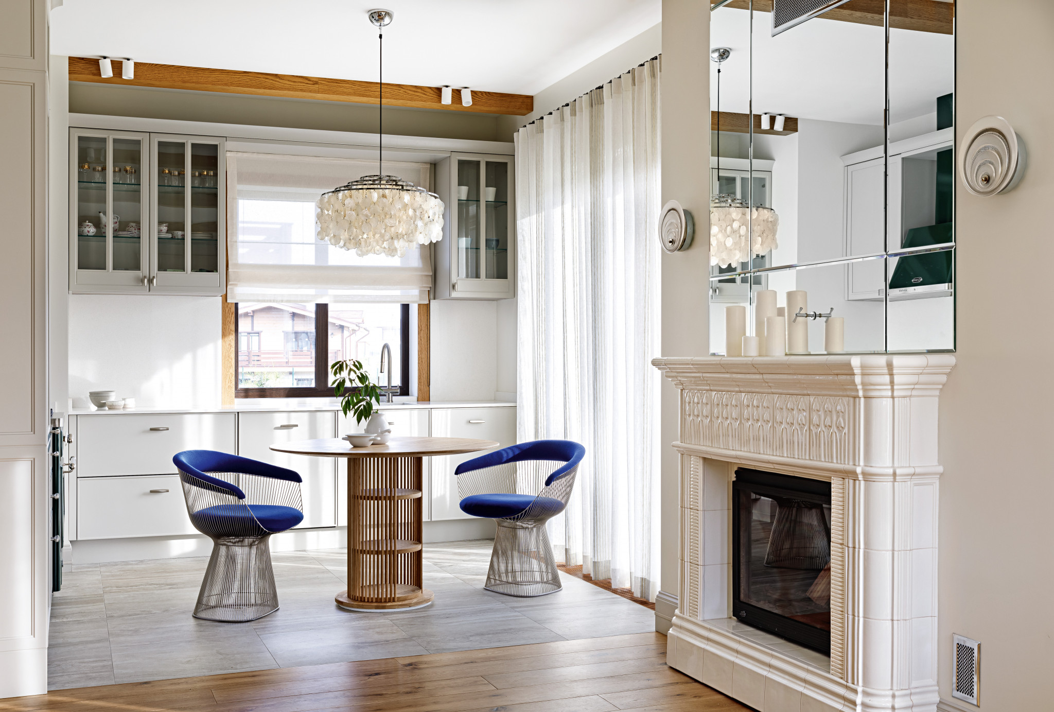 В этом доме живут молодая красивая женщина и её сын. Они увлечённо занимаются горнолыжным спортом, поэтому помимо инфраструктуры посёлка, близости к городу и прекрасных видов для них важно было наличие рядом любимых склонов для катания. Виктория Люлина рассказывает, что несколько лет назад оформила для этой семьи квартиру в центре Санкт–Петербурга. Там интерьер подчёркнуто современный, и в городе это смотрится очень органично.