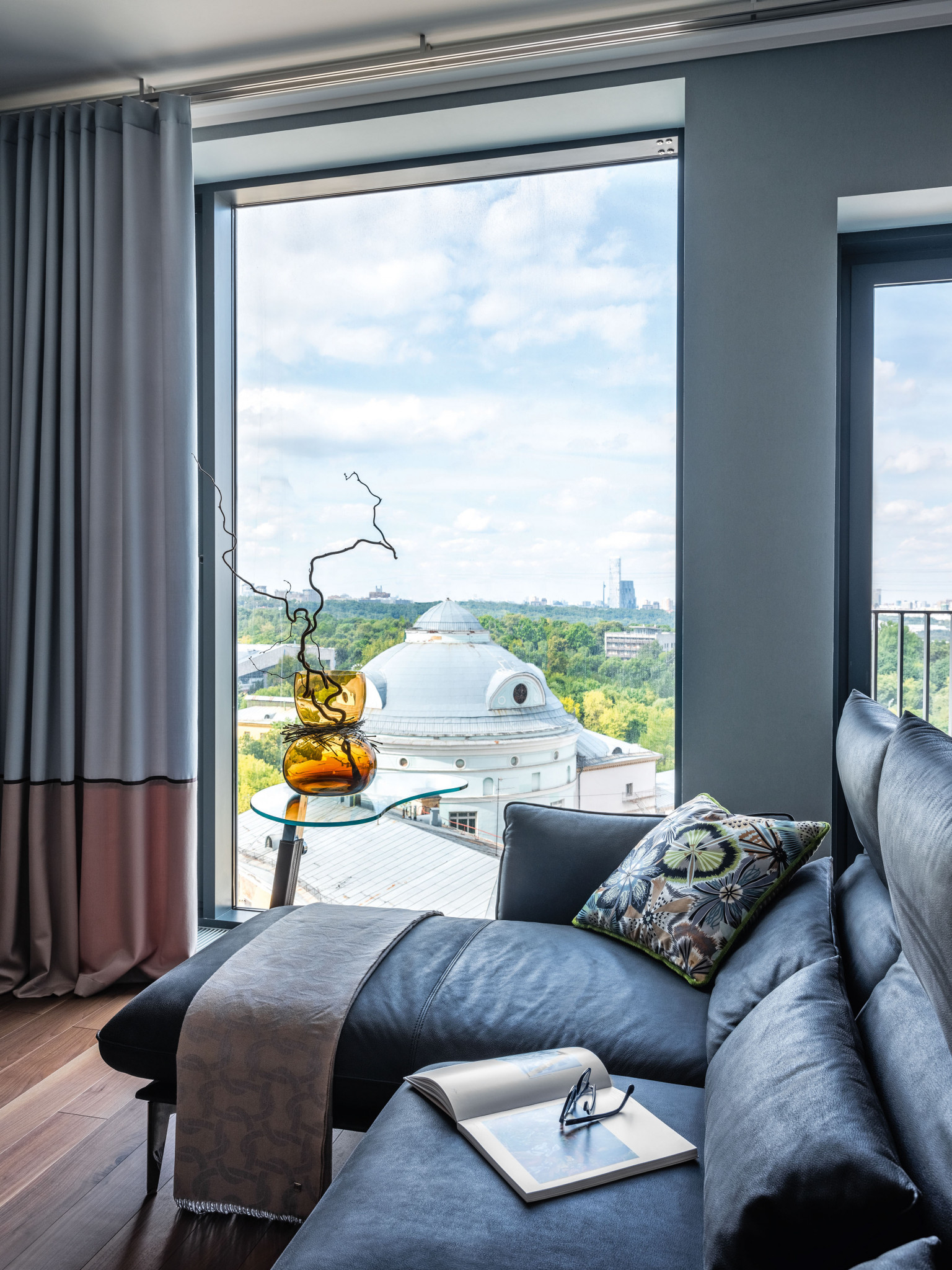 Cовременный жилой комплекс апартаментов в знаковом для москвичей месте—на Воробьёвых горах, квартира с окнами в пол, за которыми расстилаются красивейшие виды на Москву–Сити, МГУ и дом на Мосфильмовской—таковы были исходные данные квартиры, где планировали поселиться супруги. «Много лет они работали в разных европейских странах: Италии, Франции, Греции,—рассказывает автор проекта.—Теперь же, вернувшись в Россию, вырастив детей, решили сделать для себя комфортную квартиру. Заказчикам хотелось получить уютный современный интерьер, но такой, чтобы в нём читался и ассоциативный ряд—«воспоминания» о любимых странах и городах». Так, например, родилась идея сделать в прихожей панно из стекловолокна, на котором изображено старинное французское шато, напоминающее хозяевам о годах, проведённых ими во Франции. А в столовой появилась итальянская тема—панно «Милан под водой», сделанное по индивидуальному заказу в мастерской FORNASETTI. Стиль—современный с элементами эклектики, объединивший мебельные новинки, инновационные материалы и оригинальные авторские приёмы, винтаж и арт. Нашлось место и для современной интерпретации классики: так, в кабинете стены декорированы обоями с типично английской классической