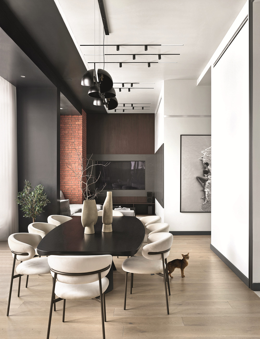 Просторный пентхаус, над интерьером которого работала студия интерьерного дизайна GDS, расположен в жилом комплексе «Сити Парк» в Москве. Владелец — молодой мужчина, обратился с просьбой сделать планировку таким образом, чтобы был задействован каждый сантиметр площади, количество комнат сведено к минимуму, а центром пространства стала просторная гостиная. «Наш заказчик — невероятно харизматичный человек с прекрасным чувством стиля. Мы воплотили его мечты в реальность, придав квартире неповторимый стиль и индивидуальность. Наполнили интерьер деталями, раскрывающими личность заказчика, его обаяние и мужественный характер, — рассказывает Анна Святославская, автор проекта. — Каждый элемент в этой квартире был специально продуман, чтобы создать изысканную атмосферу и подчеркнуть уникальность и привлекательность ее расположения». Главной особенностью проекта является невероятный панорамный вид. Окна расположены по периметру всего этажа — это 360 градусов удивительных пейзажей. Планировка квартиры ловко играет с эффектом проникновения света в помещение, придавая ощущение бесконечного пространства и высоких потолков. «Важным шагом в достижении этого эффекта стало решение убрать балконы, что добавило объема и естественного освещения», — добавляет соавтор Арина Стерлягова. «Стиль интерьера — графичный минимализм. Он сочетает в себе простоту и элегантность, создает сбалансированное и стильное пространство, где каждая деталь играет важную роль в интерьерной композиции. Графика на стенах и потолке является главным стилевым приемом. Она придает контраст, подчеркивая высоту потолков. Цветовая гамма основана на оттенках серого, начиная от белого и заканчивая графитовым. В квартире много цветовых акцентов. К примеру, оконные рамы и откосы темного цвета, которые добавляют интерьеру брутальности», — рассказывает автор проекта.