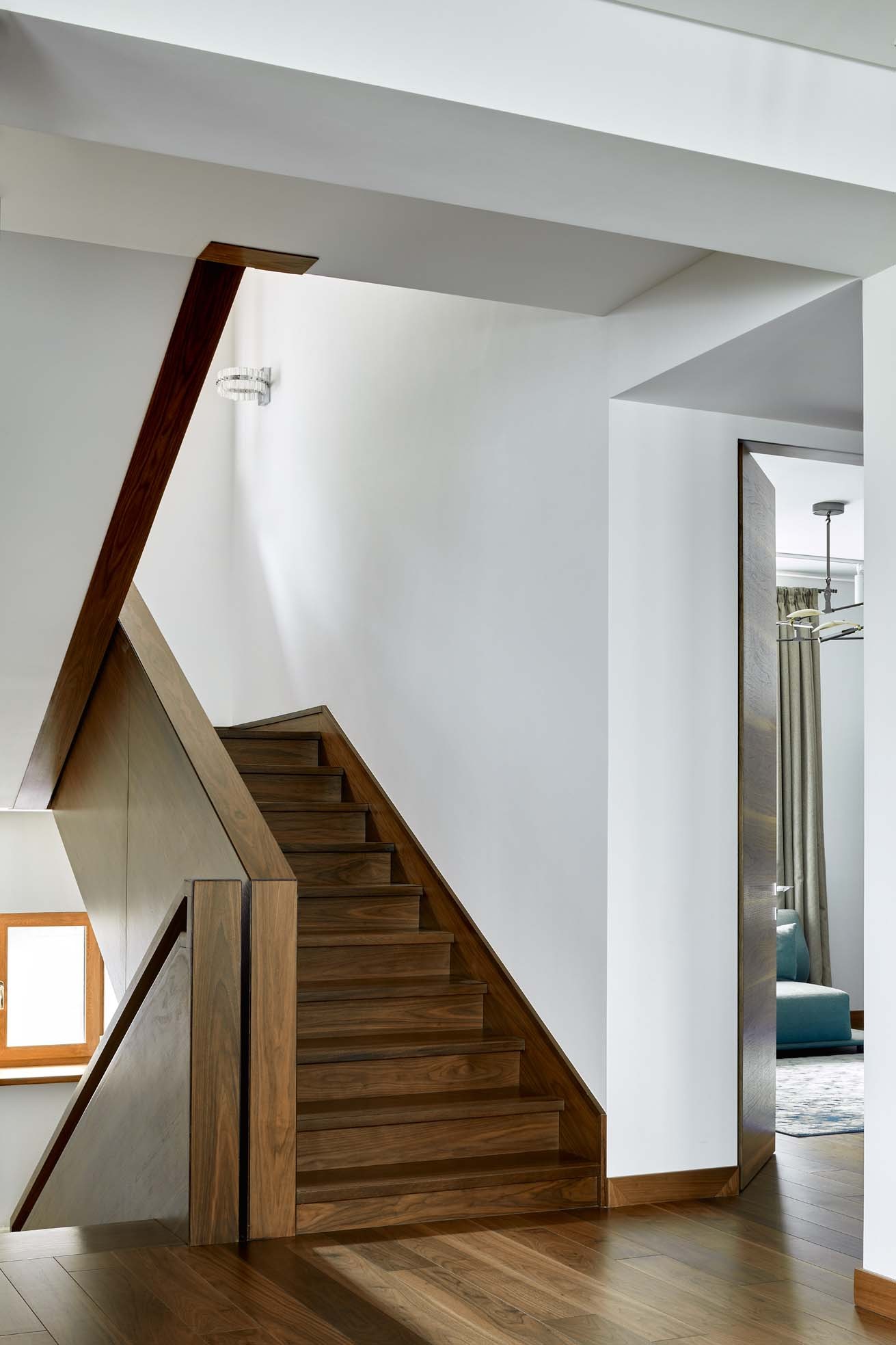 Хозяева мечтали о современном во всех смыслах доме. Исходная планировка не отвечала требованиям современного интерьера, поэтому от неё было решено избавиться и создать новое, более объёмное, светлое и открытое пространство. Первый этаж заняла семейная гостиная, объединённая со столовой и кухней. На кухне появилась панорамная раздвижная перегородка, ведущая на открытую террасу и позволяющая любоваться видами гор. Лестница — ещё один значимый элемент пространства.