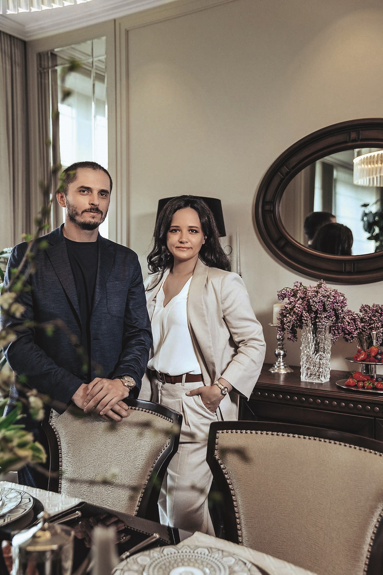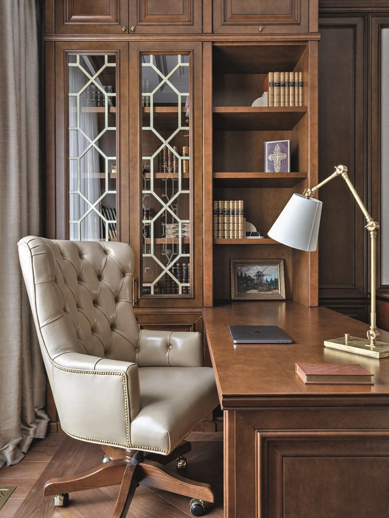 Планировка квартиры ясная и комфортная: справа от входа — парадная зона, состоящая из гостиной и кухни-столовой, слева — приватная, со спальнями и кабинетом. В спальной зоне удалось выделить место для двух отдельных гардеробных и при этом сохранить большое пространство для ванной комнаты. В квартире три санузла, а также есть маленькая, но функциональная постирочная. На планировочное решение повлияли несущие колонны и расположение мокрых зон, поэтому не получилось избежать коридоров, но их задействовали для создания дополнительных мест хранения. А самое главное, что коридор между приватной и парадной частями квартиры удалось превратить в элегантный, классический по стилю холл — за счет узора на полу, выполненного в технике инкрустации латунью, и архитектурно выразительного потолочного купола. «Он получился вследствие грамотной работы с высотами, — объясняет управляющий проектом Александр Пригодич. — Часть потолка в коридоре пришлось занизить для прокладки системы вентиляции, но в центральной точке мы сохранили высоту 3,5 метра и подчеркнули ее куполом». Дополнительным акцентом в этой зоне служит знаковая хрустальная люстра Baccarat. В этой квартире есть и второй подобный купол — он расположен на потолке в столовой над обеденным столом: центр купола и стола находится на единой оси. Акцент сделан на работе с природным рисунком мрамора: с помощью раскладки и естественного узора камня на полу создали центр композиции, который совпал с центром стола и купола. Благодаря таким деталям интерьер выглядит безупречно, а чтобы придать ему живость, его дополнили красивыми акцентными вещами. Это, например, золоченая резная консоль и камин в гостиной. Или, допустим, люстра в столовой: в солнечном свете кристаллы создают фантастическую игру бликов. «Этот интерьер по сути эклектичный, с элементами современной классики, — объясняет Диана. — Мы уже давно не ориентируемся на чистые стили, а стараемся создать гармоничное пространство, исходя из запроса заказчика. Тренды скоротечны; мы же стремимся сделать интерьер, который будет оставаться актуальным на протяжении многих лет — такой, который не захочется менять еще лет двадцать». Технологически эта квартира исключительно современна: она оснащена системой «умный дом», которая отвечает за канальное кондиционирование, увлажнение воздуха, акустику, сценарии освещения, сюда же подключены система безопасности и видеонаблюдение. Казалось бы, здесь уже есть всё для комфорта хозяев, но интерьер продолжает улучшаться. Недавно, уже после того, как объект был сдан и проведена съемка, авторы подобрали в столовую сервиз Bernardaut, компаньоны от Baccarat, Lalique, менажницы Villari, кофейные пары, вазы Lalique и бокалы, а интерьер кабинета дополнили скульптурами от Villari.