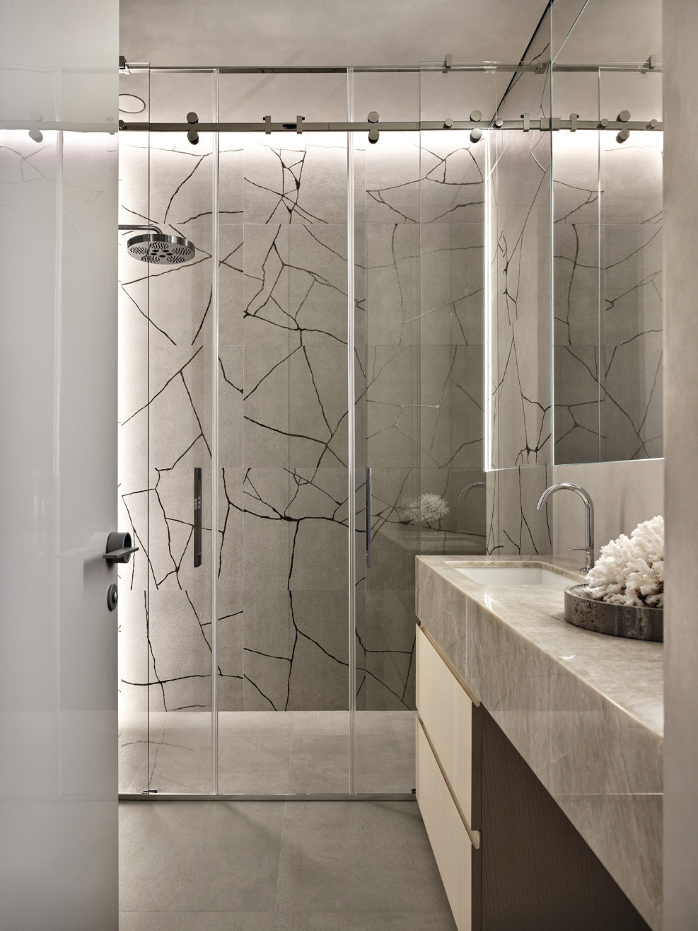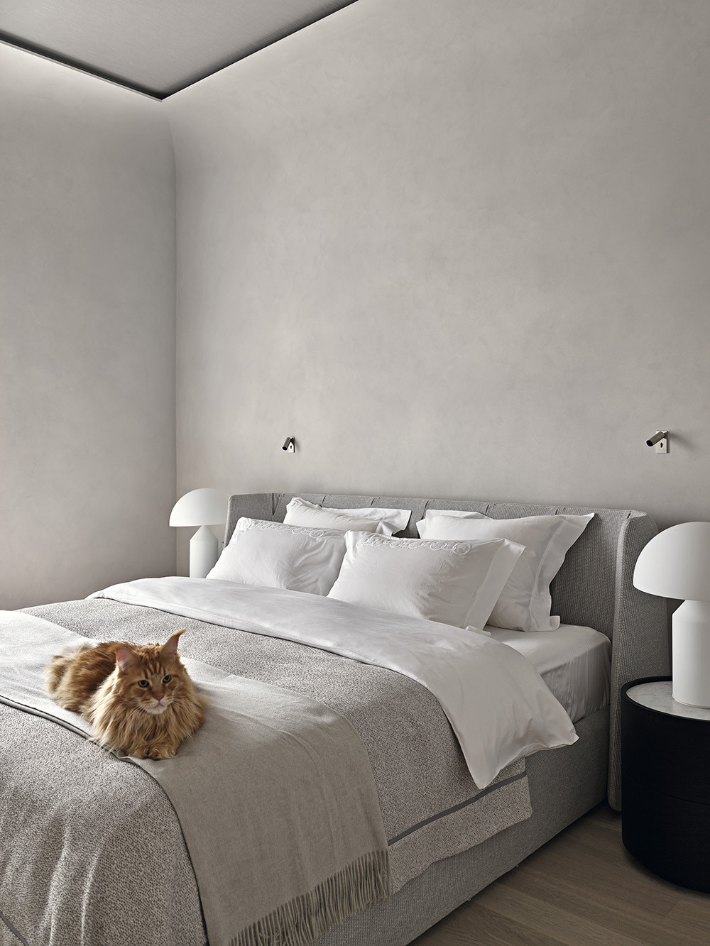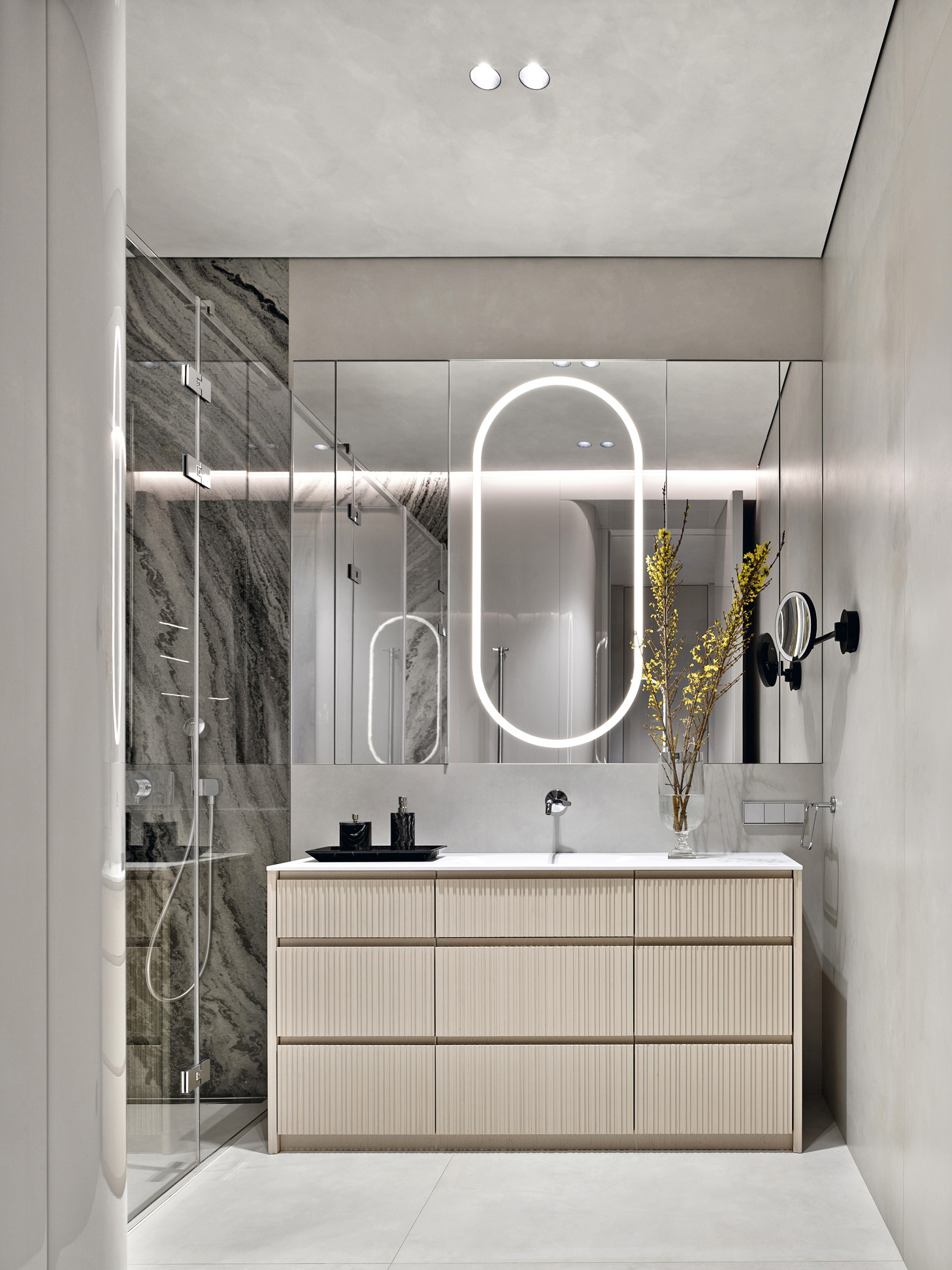 Когда во всех помещениях — единые отделка и цвет, возрастает важность акцентных деталей интерьера. Здесь акценты расставлены очень деликатно. Так, например, в хозяйском санузле эффектно смотрится стена из натурального мрамора — на контрасте с керамогранитом, подобранным в тон к штукатурке. А в спальне в вечернее время благодаря специальной подсветке выделяется потолок, отделанный шелковыми обоями. В проекте предусмотрено много различных сценариев света для каждой части пространства: это и общий свет, и теплые подсветки для атмосферы, и акцентные светильники — арт-объекты, и подсветка рабочих зон, и технический свет. «Кажущаяся простота интерьера — это результат кропотливого труда, высочайшего профессионализма и стремления к совершенству», — резюмирует Андрей Юдин.