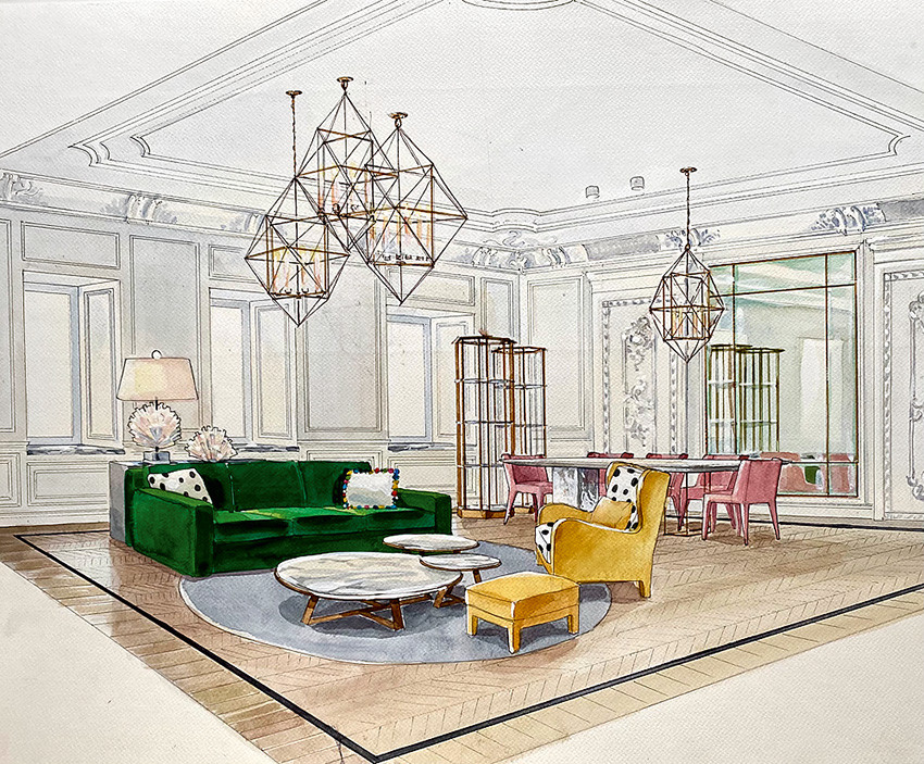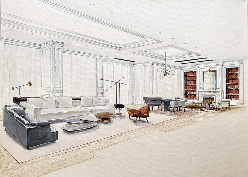 В этом году мы все освоили технологии дистанционной работы с клиентами: заключали договора по переписке и делали презентации в Zoom. И вообще вся жизнь стала более цифровой. Но я по-прежнему предпочитаю делать рабочие эскизы к проектам в виде акварельных рисунков.
