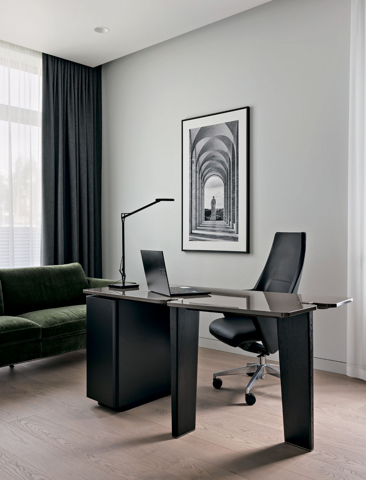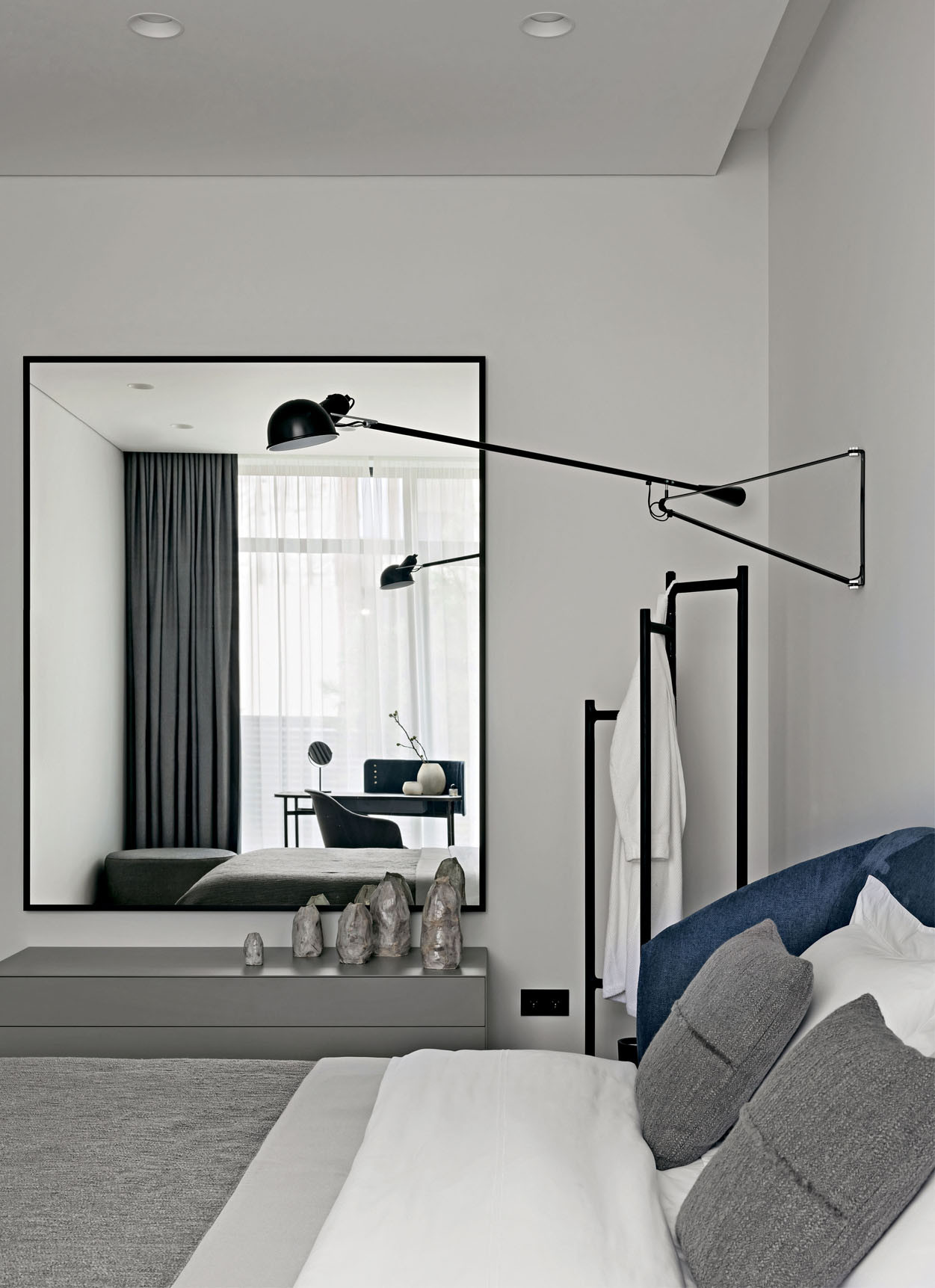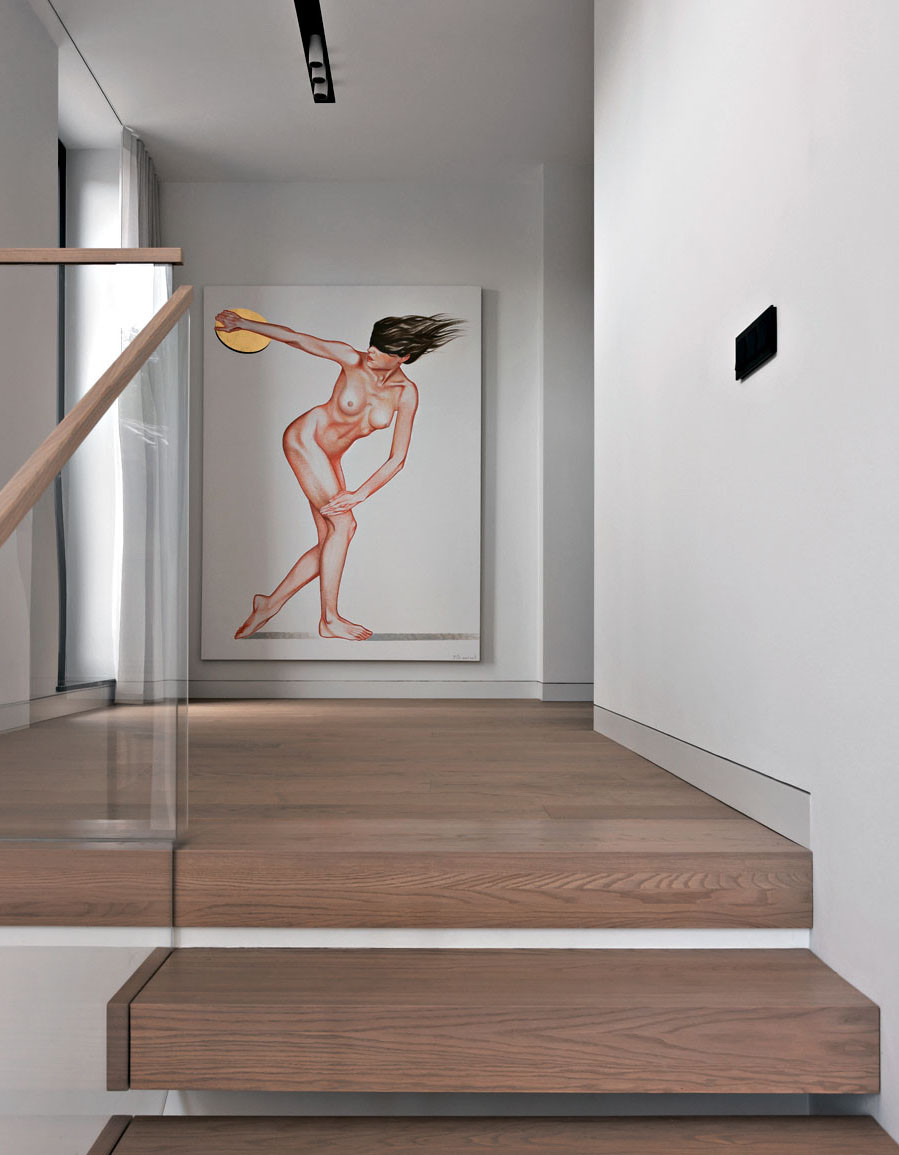 Юлия Скачкова в своей работе придерживается принципов функционализма. «Я решила, что хочу максимально функциональный дом для двух взрослых и двух детей, — объясняет она. — Каждое решение должно иметь значимость и обоснование». Двухэтажный дом органично вписывается в ландшафт и с некоторых ракурсов выглядит одноэтажным. Такой эффект возникает из-за большой террасы на втором этаже и удаленности жилых зон второго этажа, которые как бы отодвинуты вглубь участка. Когда-то Юлия рассматривала одноэтажный дом — лаконичный, неброский, по-европейски скромный. Но дом в один этаж занял бы слишком много места на этом участке, а во-вторых, хотелось сделать планировку компактной, без лишних коридоров. Поэтому часть комнат архитектор «увела» на второй этаж: там расположены детская спальня с санузлом и гардеробной от ALF DAFRE, а еще тренажерный зал, который, если понадобится, легко переформатировать во вторую детскую. На первом этаже — гостиная, кухня-столовая, главная спальня и кабинет.