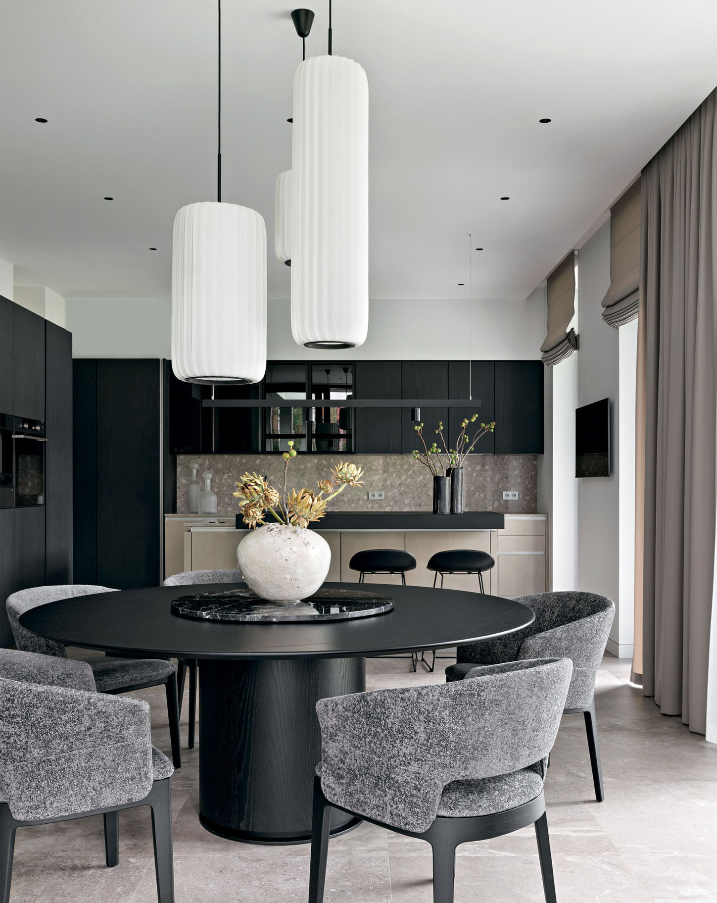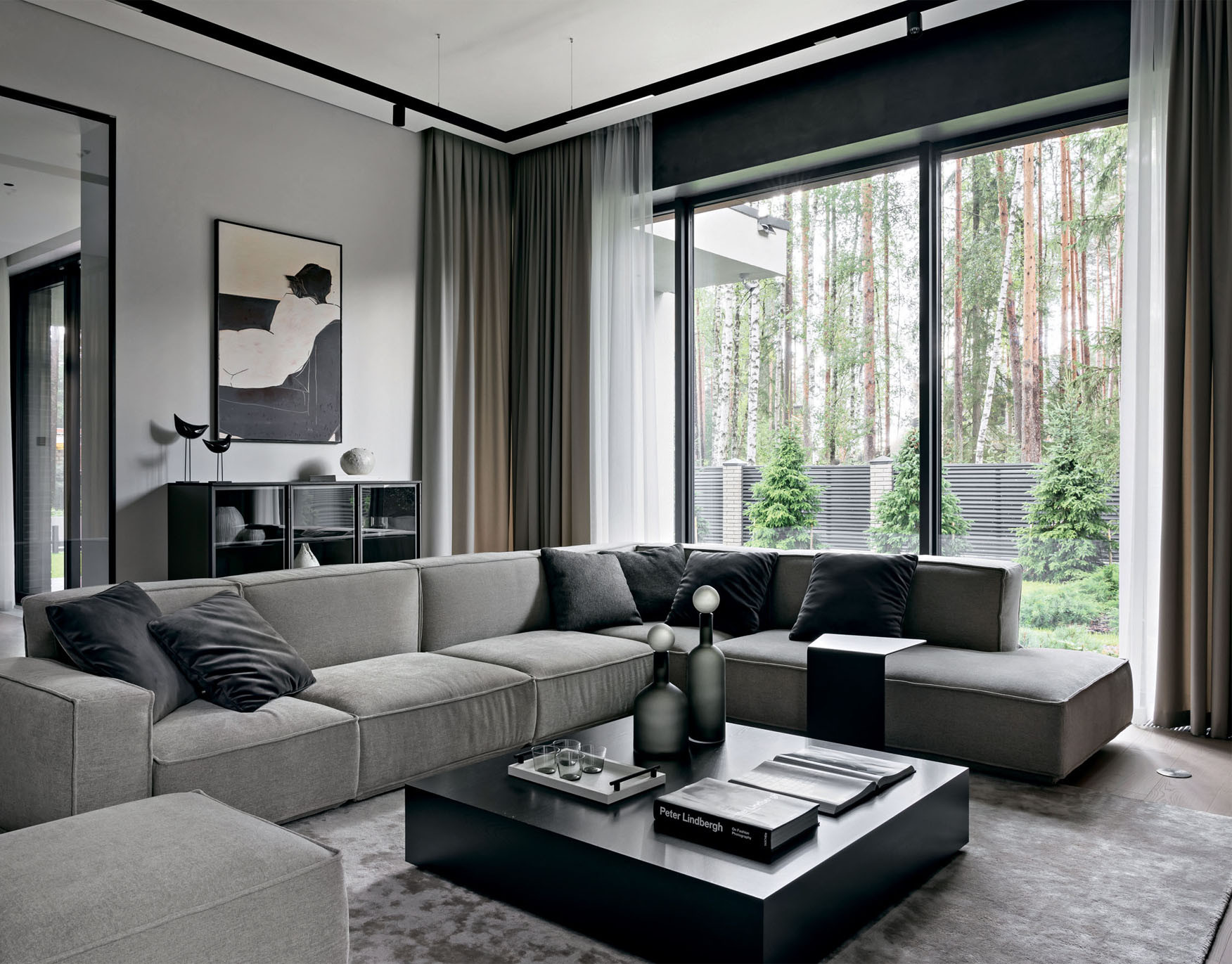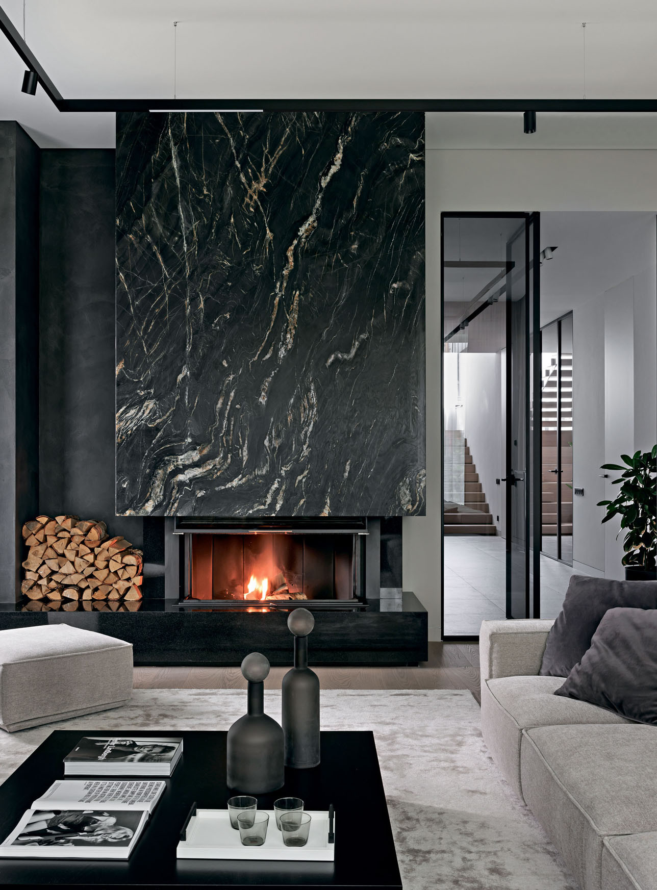 Дом состоит из нескольких основных архитектурных объемов, которые подчеркнуты при помощи разных материалов: черного кирпича, фасадной штукатурки оттенка серого питерского неба и брутальной коричнево-рыжей кортеновской стали в цвет стволов сосен. Отделки фасада перекликаются с окружающим ландшафтом и с интерьером. Так, основной объем стен также решен в светло-сером оттенке, а акценты расставлены при помощи мебели: она черная, из матового дерева. Например, одна часть фасадов кухни выполнена из темного обожженного дерева, а другая — с цементным текстурированным декором. Покрытие — натуральное, на фасады нанесено вручную. «Выбирая кухонный гарнитур, я учитывала сочетание качества, функциональности и дизайна, — объясняет архитектор, — и подходящую по всем характеристикам кухню нашла у NOLTE KÜCHEN. Кроме того, у этой фабрики богатые, интересные фактуры дерева и бетона, добавляющие глубины интерьеру». А еще Юлии нравится, что она реализовала в собственном доме один из самых своих любимых приемов: консоль как тип конструкции. Над террасой — большой, в три метра, консольный свес кровли, а в интерьере — лестница с консольными ступенями, визуально очень легкая. Эту лестницу создали на заказ по чертежам Юлии на столярном производстве «СЕНДЕГА». На вопрос, почему же в таком случае архитектор не стала сама проектировать и мебель для собственного дома, она отвечает, что проектировать надо, когда нужно то, чего пока не существует: «Мне же хотелось выбрать из того, что уже придумали дизайнеры: красивый стол, красивый диван. И в этом мне очень помогли наши петербургские салоны: POLLINI CASA — поставщик европейской мебели и сантехники, ALF ITALIA HOME — салон-представитель итальянского бренда ALF DAFRE». Но главный центр притяжения в интерьере — камин в отделке слэбом бразильского мрамора (камин изготовила на заказ компания «МАГИЯ КАМИНА»). Юлия так продумала конструкцию, что кажется, будто огромный тяжелый слэб парит в воздухе, и это завораживает. «Можно придумать что-то красивое, но обязательно нужно объяснить это решение с точки зрения функции, — объясняет она. —Такого подхода я придерживаюсь и в своей рабочей практике».