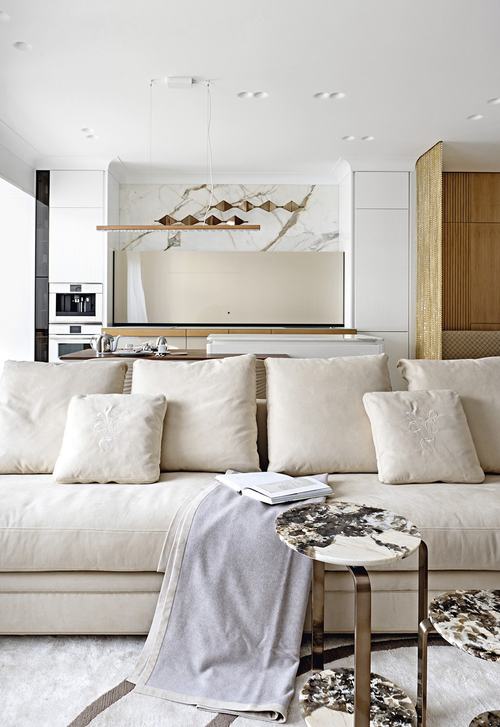 Для создания новой планировки были демонтированы все существующие перегородки. С помощью зеркальной раздвижной двери гостиную с кухней отделили от приватной зоны, в которую вошли спальня, ванная комната и гардеробная. По замыслу Екатерины Богачик, при входе в приватную часть квартиры владелицу должна встречать ее любимая хрустальная статуэтка «Влюбленные» от DUCCIO DI SEGNA: фигуру как бы обнимает скругленная реечная перегородка. Знаковый арт-объект подчеркнули посредством ниспадающего света, который особенно эффектно смотрится по вечерам. Так как кухня представляет собой часть гостиной, одна из ее функций — служить украшением квартиры. Поэтому здесь появились два красивых светильника Sputnik от VISIONNAIRE.