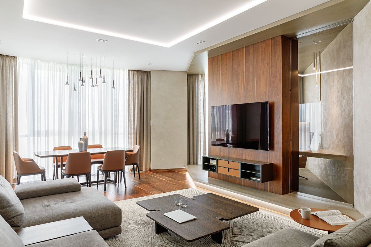 Молодой владелец поставил перед дизайнером Анной Пронь интересную задачу — создать современное, по-европейски стильное пространство. Среди обязательных пожеланий: отдельно стоящая ванна, кинозал для вечерних просмотров спортивных мероприятий в компании друзей, большая гардеробная для хранения обуви, использование натуральных материалов (дерева, мрамора) с выразительными текстурами. Они, как и сложная конфигурация квартиры, во многом обусловили дизайн–концепцию. «В северной части квартиры находится полукруглый выступ с панорамным остеклением, —комментирует Анна. — Именно отсюда открывается самый эффектный вид на город, и при этом тут всегда прохладно, что особенно важно, учитывая климат южного региона. Одним словом, сочетание неяркого света внутри и мощной энергетики города снаружи. Днём пространство выглядит мягко, приятно, зато вечером наполняется сверкающими огнями мегаполиса. Нам хотелось сохранить это ощущение, но так, чтобы интерьер не перетягивал внимания на себя и в то же время был сильным, мужественным, под стать динамичному характеру владельца. Отсюда — сочетание тёмных и светлых оттенков, игра на контрасте». В планировочном решении максимально задействованы плюсы исходного объёма. Так, верхнюю половину (с панорамными окнами) выделили