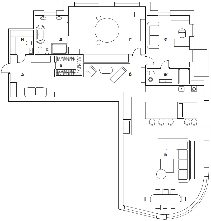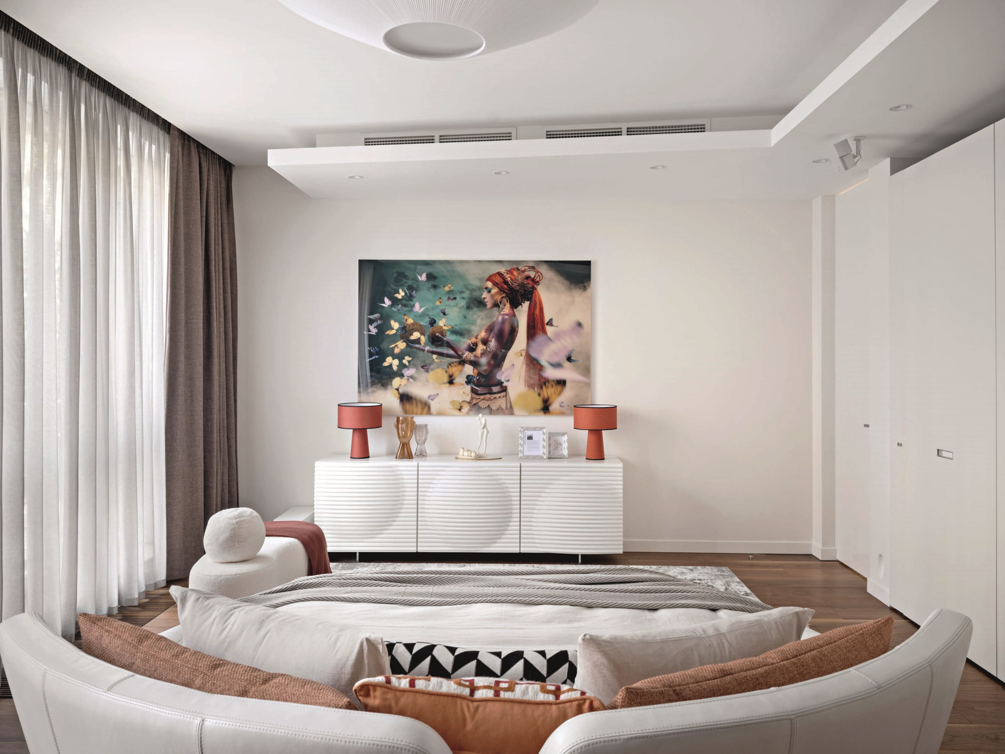 Эксперименты с зонированием продолжаются и в приватном блоке. В самом центре спальни — эффектная круглая кровать от Ivano Redaelli. Она визуально разделяет пространство и задает ритм другим элементам мебели — мотив круга повторяется и в форме светильников, и в авангардном рисунке комода. «Создавая интерьеры, я стараюсь опираться не на тренды, а на характер и пожелания заказчиков, их личные истории. В этом проекте мне удалось воплотить идею смешения стилей, но спокойного и гармоничного. Так хозяева квартиры смогут легко добавлять в интерьер детали, наполнять свой дом новыми смыслами, при этом общая концепция не нарушится», — заключает Алексия.