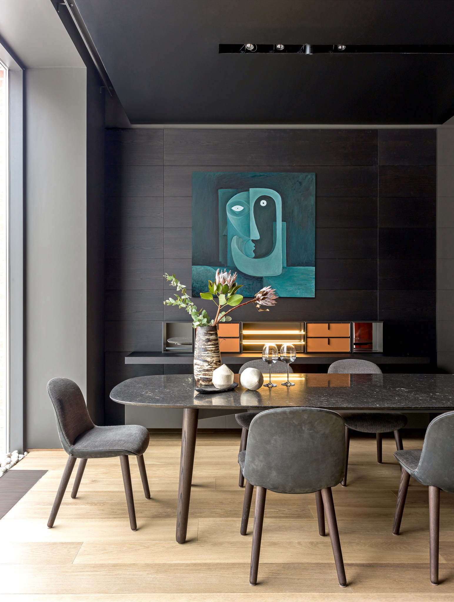 Фабрика Antolini работает с натуральным камнем. Эту интерьерную композицию для неё спроектировал известный дизайнер Алессандро Ла Спада. Он подчеркнул диковинную красоту гранита Patagonia, использовав его в отделке стен, и эффектную фактуру окаменелого дерева Retrò Black Petrified Wood, из которого сделаны столешница обеденного стола и топ комода от компании