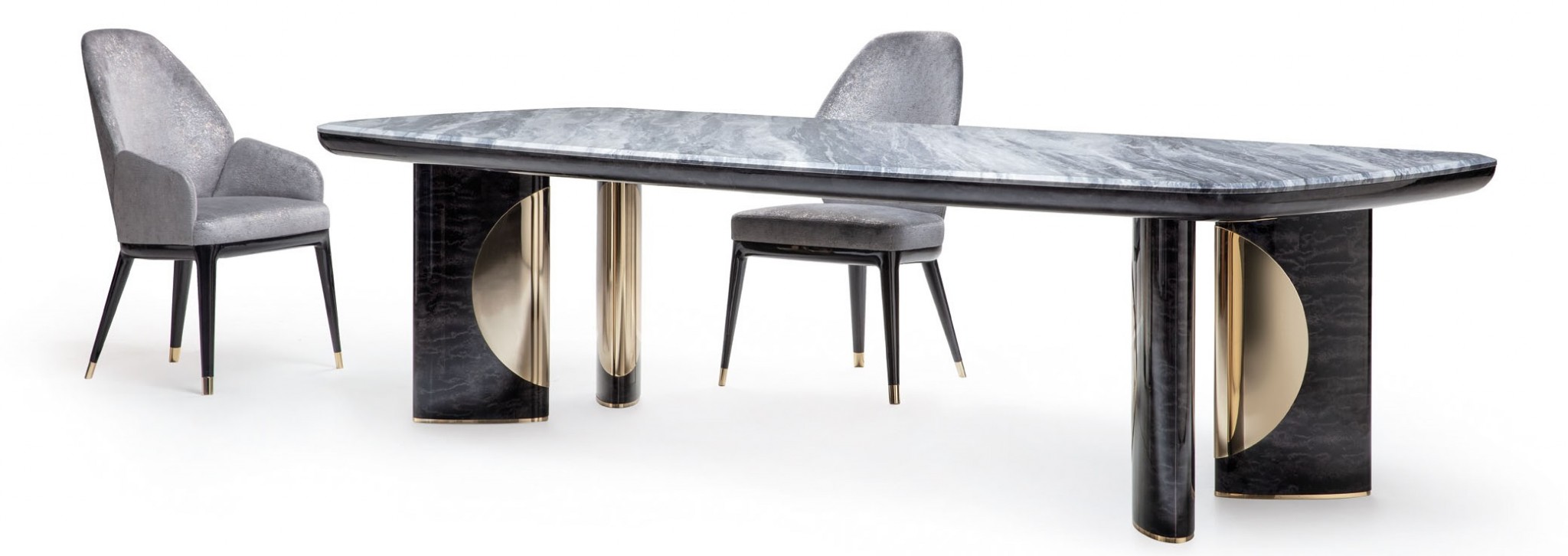 Украшением стола Charisma от Giorgio Collection служат серый мрамор столешницы, ножки, отделанные шпоном Black Bubinga под защитным слоем из глянцевого полиэстера, и детали из хромированной нержавеющей стали. Флагманский салон в Casa Ricсa EXPO.
