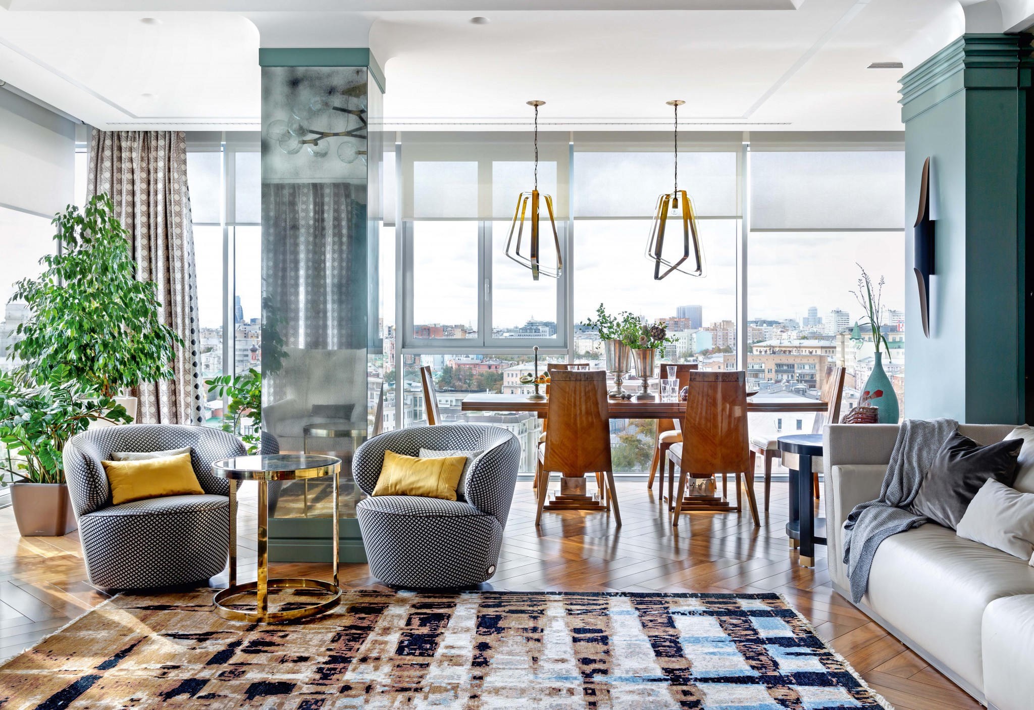 Квартира расположена в ЖК «Легенды Цветного». Несомненное достоинство пространства — панорамные окна по двум сторонам квартиры. Они оказали существенное влияние на планировочное решение. Угловое остекление в гостиной сделало город полноправным элементом интерьера. Из соображений комфорта кухню решили сделать отдельным помещением. Но чтобы не «потерять» вид, зону кухни оборудовали перпендикулярно окнам вдоль одной из стен и отделили от гостиной цельностеклянной перегородкой.