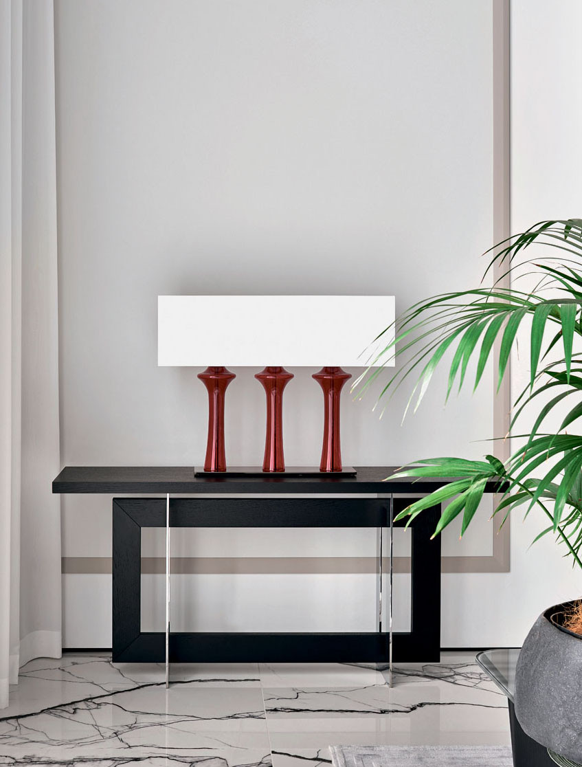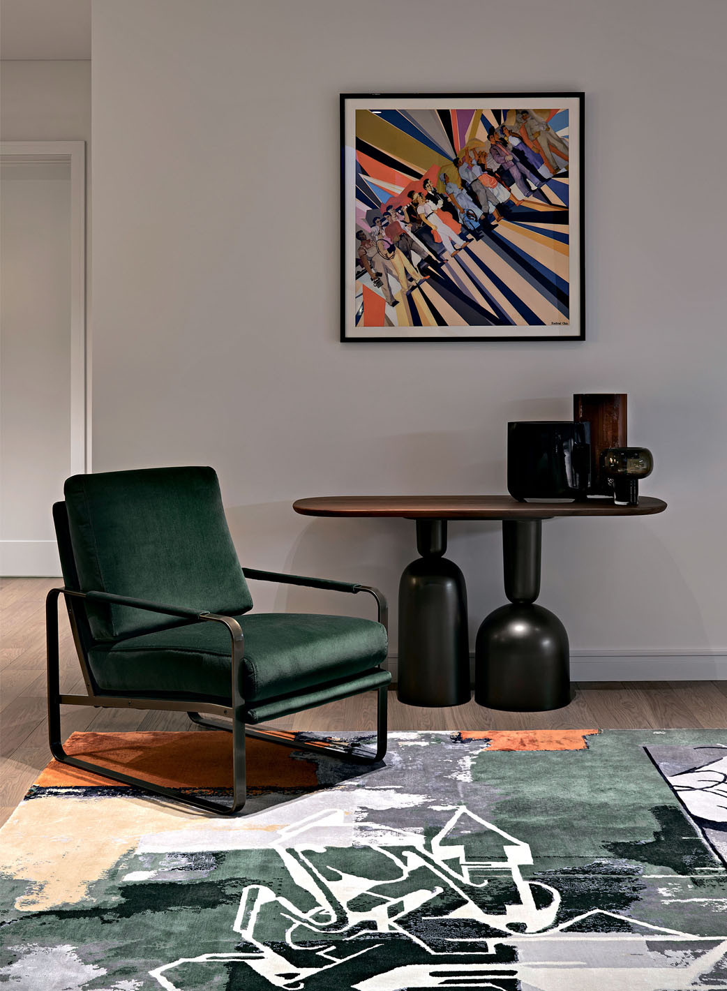 Зона отдыха. Визуальный акцент — платок в стилистике агитационного текстиля, обрамленный в багет. «Наша студия работает в разных стилях, и мы считаем это огромным преимуществом, — объясняет Елена Лукинская. — Задача профессионала — услышать пожелания заказчика, сделать дизайн в заданном направлении, причем на высшем уровне, качественно, профессионально. Привнести свое видение аккуратно и грамотно. Понять мечту заказчика и воплотить ее в реальность» Консоль, Bonaldo. Ковер, KULTURAKOVROV