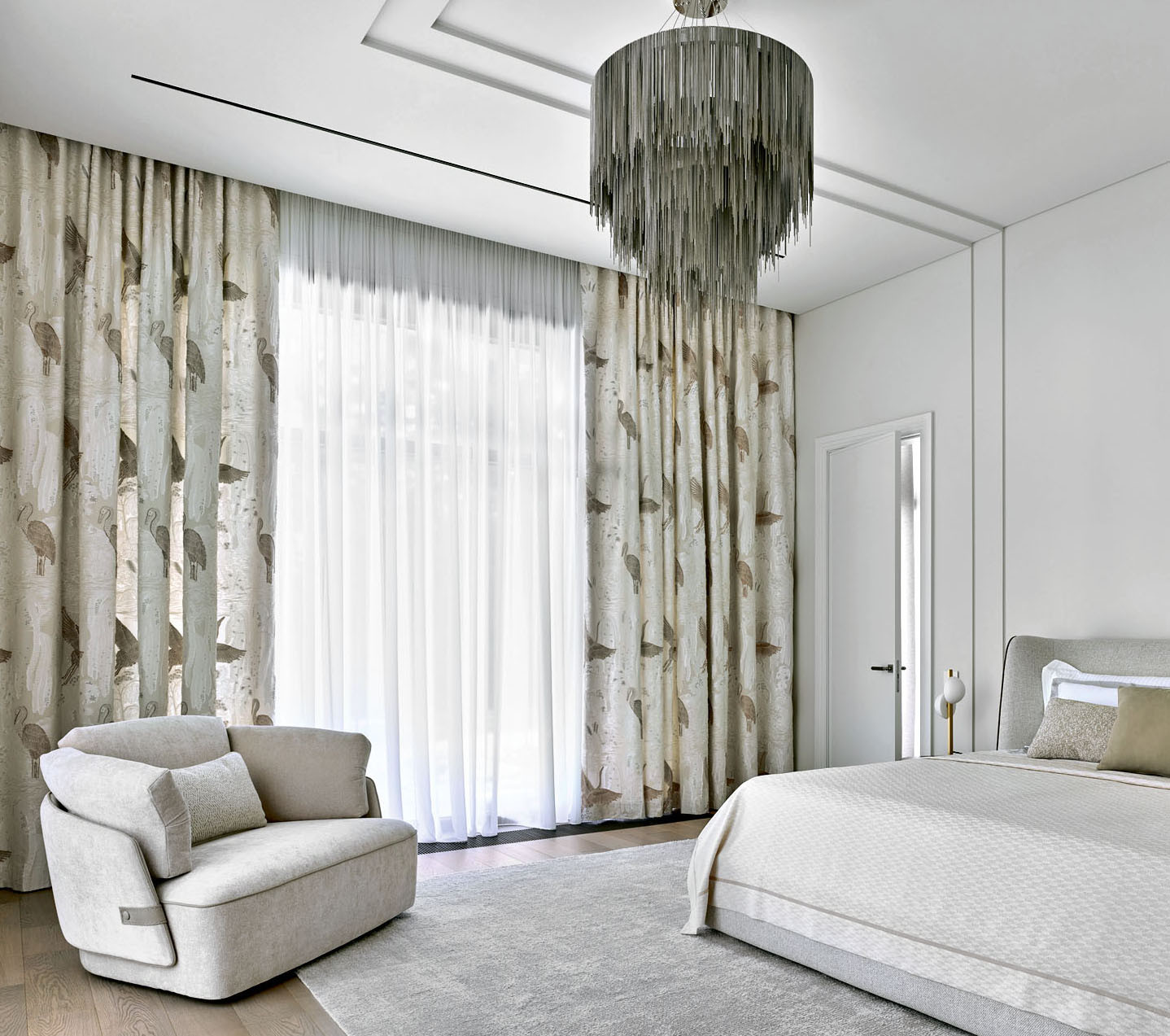 Кухня и спальня в хозяйском блоке на первом этаже. Колористика этих помещений поддерживает общую палитру интерьера, но она мягче: здесь оттенки молочно-белого, бежевого и натурального орехового цвета. Кухня, Lema. Стулья, Cattelan Italia. Светильники, ITALAMP. В спальне: кресло Gamma Arredamenti, портьеры в стилистике японской пейзажной акварели из ткани Zimmer+Rohde, ковер, KULTURAKOVROV