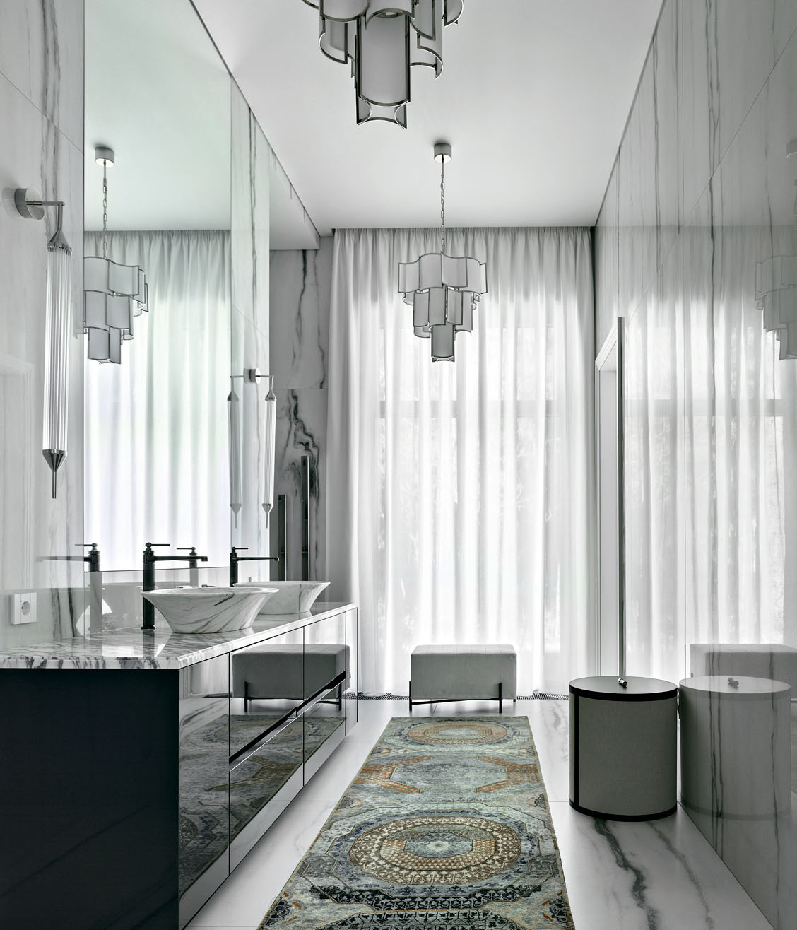 Ванная комната в хозяйском блоке — с роскошным панорамным окном. Большое зеркало и стена, отделанная крупноформатным керамогранитом, визуально увеличивают пространство. Темная мебель Milldue выполняет акцентную функцию. Люстра, Officina Luce