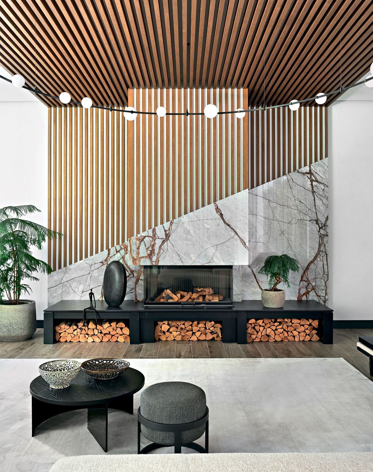 Крытая терраса с каминной зоной. Камин от компании «Центр Саун и Каминов» оформлен мрамором и деревянными рейками, а дрова играют роль одного из декоративных акцентов, на контрасте подчеркивая утонченность общего художественного решения