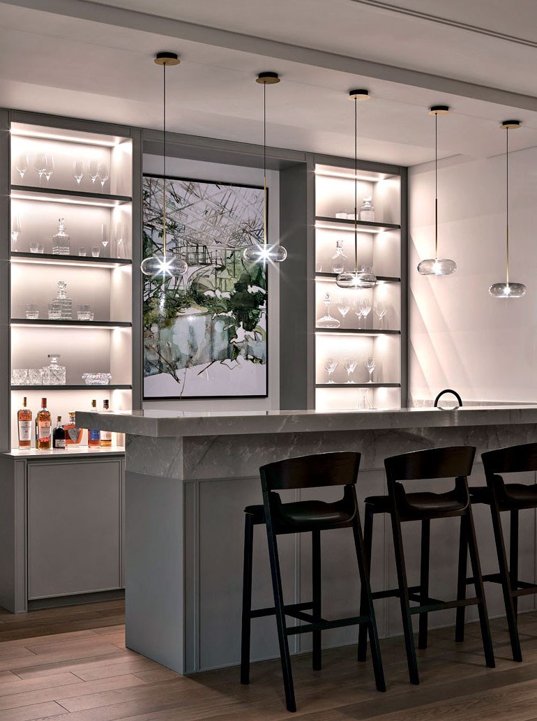 Цокольный этаж — территория развлечений. Здесь спроектировали домашний кинотеатр, также есть бильярд, зона для игры в настольный теннис, бар, винотека и кухня. Два кресла у столика в баре, Poliform