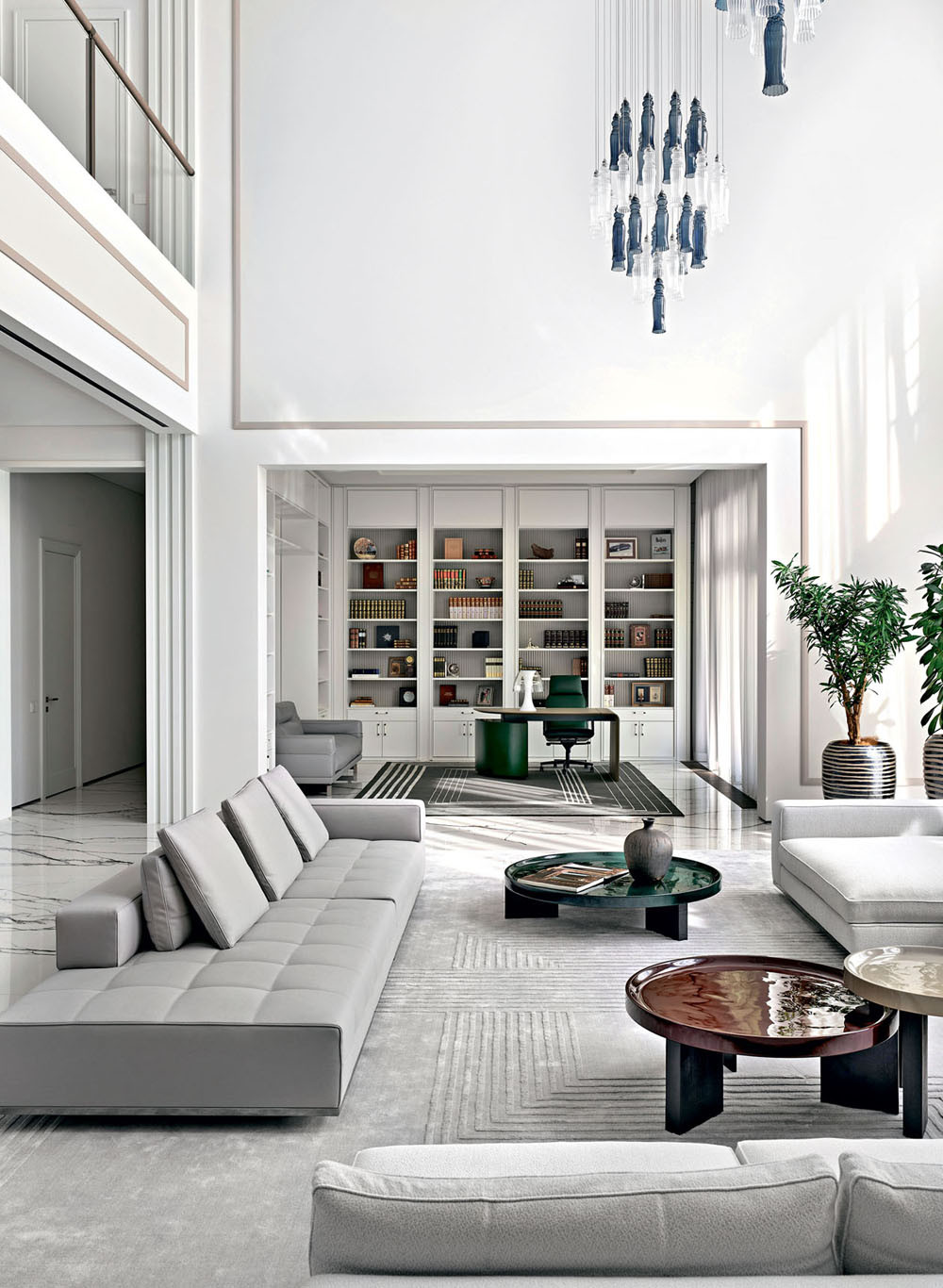 Двусветное пространство гостиной. Диваны, журнальные столики, дизайн Rodolfo Dordoni, Minotti. Люстра, дизайн Roberta Vitadello, Stefano Traverso, ITALAMP. Ковер изготовлен на заказ по эскизу Елены Лукинской компанией KULTURAKOVROV