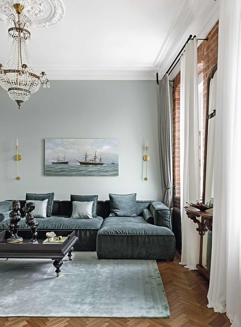 С особенным вниманием отнеслись к историческому наследию: постарались максимально сохранить стены, намеренно где-то с неровностями, частично обнажили кирпичную кладку, бережно восстановили старинную лепнину — благодаря этому пространство выглядит живым и подчёркнуто аутентичным. Здесь красиво перемешана антикварная и современная дизайнерская мебель, работы современных художников и старых мастеров (так, в спальне обращает на себя внимание работа питерской художницы Екатерины Элефтериади, а в столовой небольшая гравюра — копия «Вирсавии» Брюллова). Благодаря такому контрасту пространство выглядит актуально и при этом несёт мощный заряд timeless — интерьера вне времени. «Заказчики — ценители антиквариата, — говорит Полина Афонская. — Но они современные люди, и, помимо старинных, они ценят современные функциональные вещи. Поэтому наша студия в этом проекте соединила винтаж (например, это люстра из Швеции, старинное напольное зеркало) и современные предметы интерьера, такие как удобный угловой диван прямоугольной формы, настенные