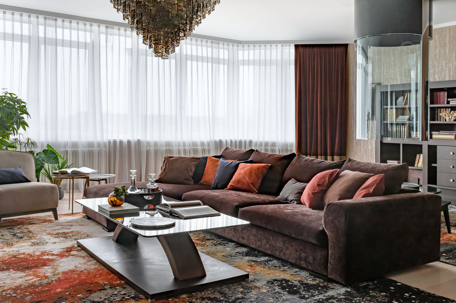 Владельцы — семейная пара с тремя детьми — обратились к Дарье Пак с просьбой освежить обстановку в своей квартире, добавить модные решения и свежие цвета. Однако в процессе разработки проекта хозяева настолько увлеклись, что решили переделать всё: снести все стены, реорганизовать планировку, изменить весь дизайн пространства. Стилеобразующим элементом нового интерьера стали любимые хозяевами предметы мебели фабрики SMANIA — именно они сформировали роскошный и вместе с тем респектабельный образ гостиной, кухни и спальни. «С заказчиками я давно знакома, наши дети ходили в один класс, — рассказывает Дарья. — Несколько лет родительских собраний и детских праздников дали нам возможность хорошо друг друга узнать ещё до начала совместной работы. И это взаимное доверие стало очень важным фактором, обеспечившим успешный ход и результат работы». Учитывая большое количество членов семьи, Дарья сделала гостиную максимально просторной, организовав в ней несколько уютных зон: диванную с большим угловым диваном, каминную и две уютные зоны отдыха с креслами и журнальными столиками. На кухне также достаточно места: зона готовки с кухонным островом и столовая с большим круглым столом. «Старшие дети со своими семьями живут в этом же жилом комплексе и практически ежедневно заходят в гости