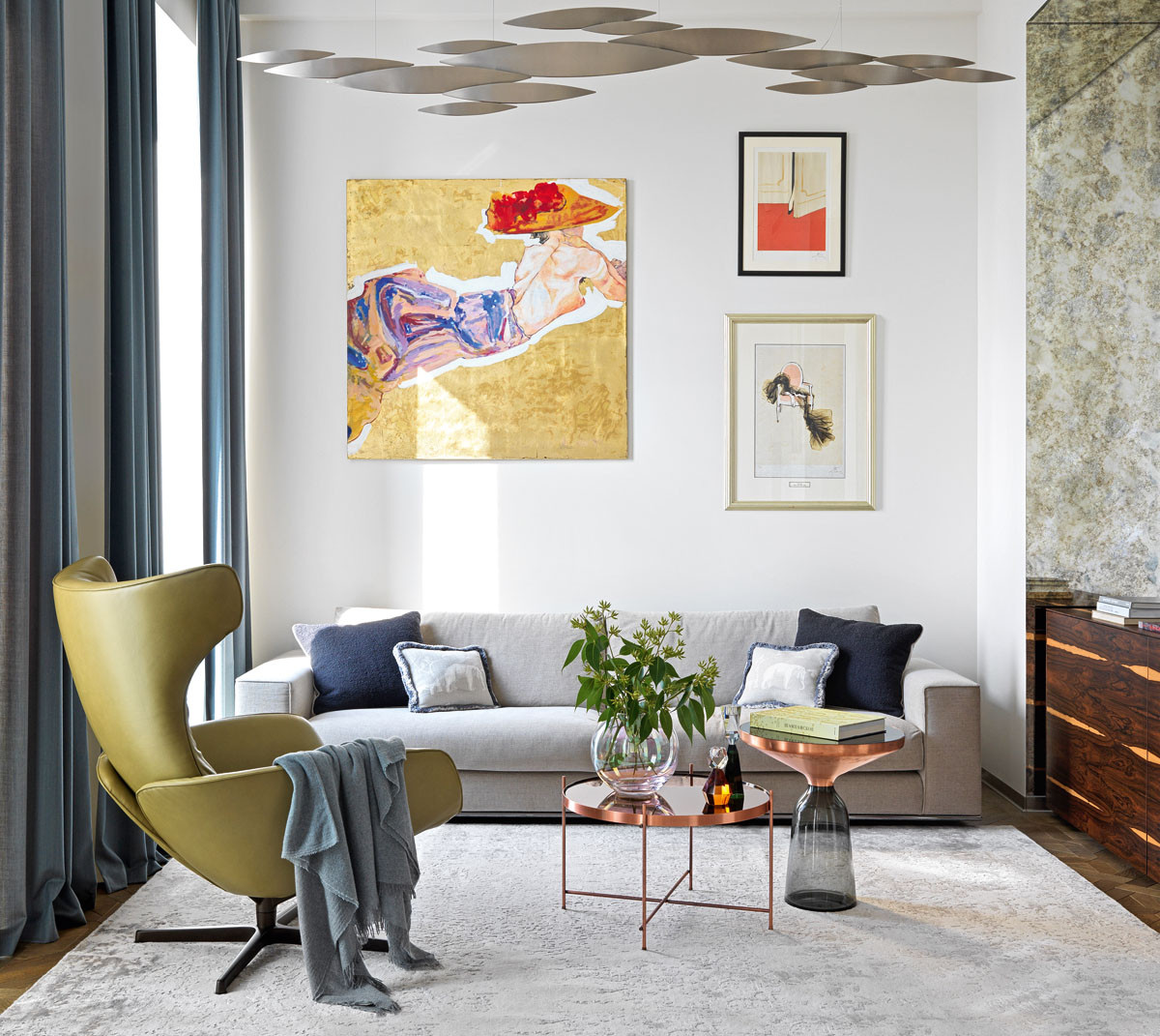 Квартира находится в одном из домов жилого комплекса «Садовые кварталы». Безусловное её преимущество — окна в пол, которые сыграли свою роль в создании атмосферы интерьера. А стиль, как признаётся Тина Камчатнова, — современная эклектика. Это сделанное на одном дыхании художественно целостное пространство даже не хочется раскладывать на отдельные составляющие. (Здесь переплелись элементы современного респектабельного стиля, арт–стиля, mid–century, шинуазри, классики — она читается в переплетениях наборного паркета.)