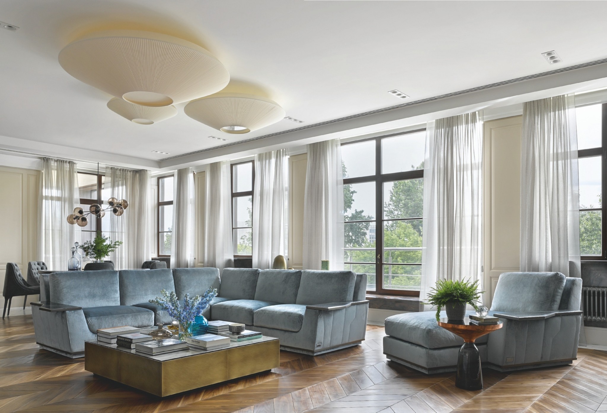 Авторы проекта сделали именно виды из окон отправной точкой будущего интерьера: отсюда открывается один из лучших видов в Москве — на парк Музеон и на Новую Третьяковку. Хотелось создать атмосферу загородного дома, где природа за окном всегда влияет на настроение интерьера, а граница между внутренним и внешним пространством в какой‑то мере условна. Благо большие окна с низкими подоконниками (а в приватных помещениях — в пол) позволяли максимально «впустить» пейзаж внутрь. В плане квартира представляет собой каре, поэтому логичным стало расположить общественную зону в центре пространства, а фланги отдать под приватные блоки: родительский и детский. От заказчиков было пожелание сделать кухню изолированной, а не интегрированной в общее пространство столовой–гостиной. Архитекторы придумали нетривиальное решение: кухня просматривается через эффектные окна–витрины. Другое решение, связанное с доступом дневного света в прихожую, — полупрозрачная перегородка, за которой находится гостиная. Эту идею архитекторов воплотили российские мастера: получился витраж, единое полотно, где сочетаются стеклянные и каменные пластины. Перегородка образует символическую визуальную преграду между помещениями и в то же время не препятствует солнечному свету. При соблюдении поставленной задачи удалось сделать отдельные помещения визуально взаимопроницаемыми. Стилистическая основа интерьера — спокойная, сдержанная неоклассика. Укладка паркета, разрезка панелей–буазери, пилоны — то, что роднит интерьер с французской классической традицией.