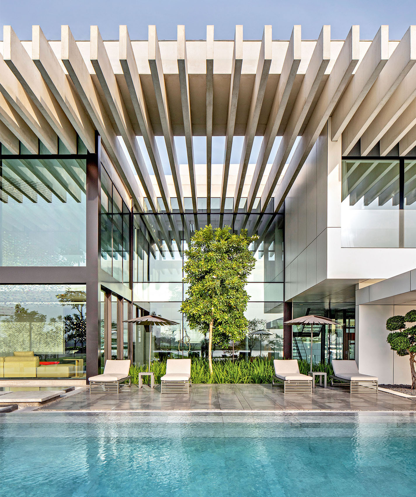 Благо климат позволяет, так что вилла, получившая логичное название Lagoon Villa, напоминает по обилию естественного света и легкости конструкций скорее садовый павильон, чем монументальную постройку. Везде, где только возможно, архитекторы применили панорамное остекление, а границу между помещениями и террасами сделали проницаемой за счет раздвижных окондверей. Остекление использовали даже на крыше, чтобы получилось как можно больше «световых фонарей», как раз дающих обилие света. Они заполняют собой пространство между несущими бетонными балками. Эта реечная конструкция опять же кажется парящей, легкой, она не перегружает собой ландшафт.
