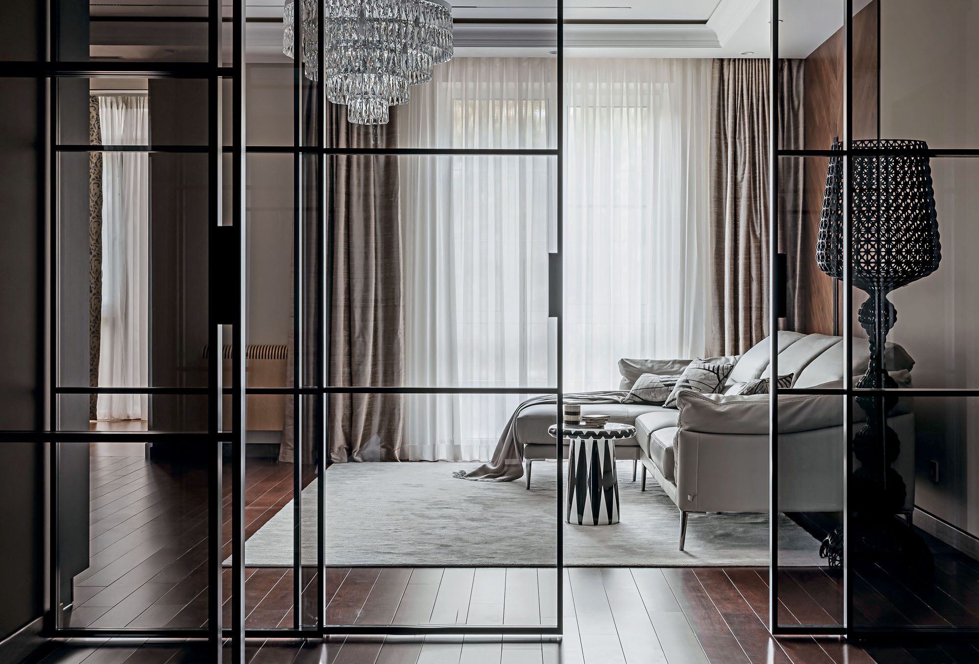 Приобретя жилую площадь, клиенты — семейная пара средних лет, обратились в дизайн-студию Ольги Пустоваловой PRIVELEGE для разработки и реализации проекта интерьера своей новой квартиры. «Для заказчиков было важно найти дизайнеров с большим опытом работы, так как они хотели реализовать проект «под ключ», именно поэтому их выбор пал на нашу дизайн-студию PRIVILEGE. Мы специализируемся на объектах, для которых проводим подбор всех материалов и мебели, осуществляем авторский надзор, комплектацию и ремонт на самом высоком уровне, — говорит автор проекта и руководитель студии дизайнер Ольга Пустовалова. — Работать над этим интерьером было легко — владельцы квартиры много путешествуют, имеют хорошую насмотренность и прекрасное чувство стиля, поэтому мы сразу нашли общий язык». Основным пожеланием клиентов было создать эффектное пространство, подчеркивающее статус и образ жизни хозяев. В то же время им хотелось, чтобы интерьер квартиры способствовал расслаблению и отдыху, чтобы всё было максимально продумано и удобно для жизни».
