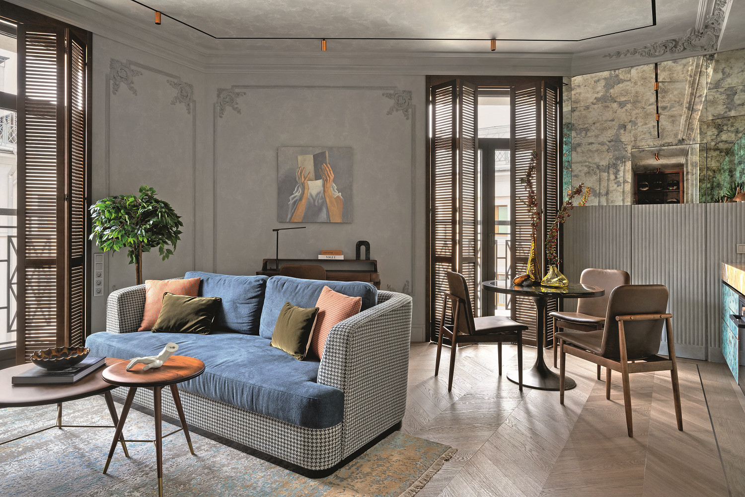 Визуальная доминанта в гостиной — диван от Lavsit с обивкой из велюра глубокого синего цвета и боковыми панелями в ткани «гусиная лапка», который продолжает тему текстильной роскоши исторических интерьеров. Инженерная доска Coswik от Artdoor regalett уложена классической французской елочкой. Светлый тон паркета помог сбалансировать насыщенные цвета мебели и отделки стен. Картина, Анастасия Геспер. Шаттерсы выполнены на заказ
