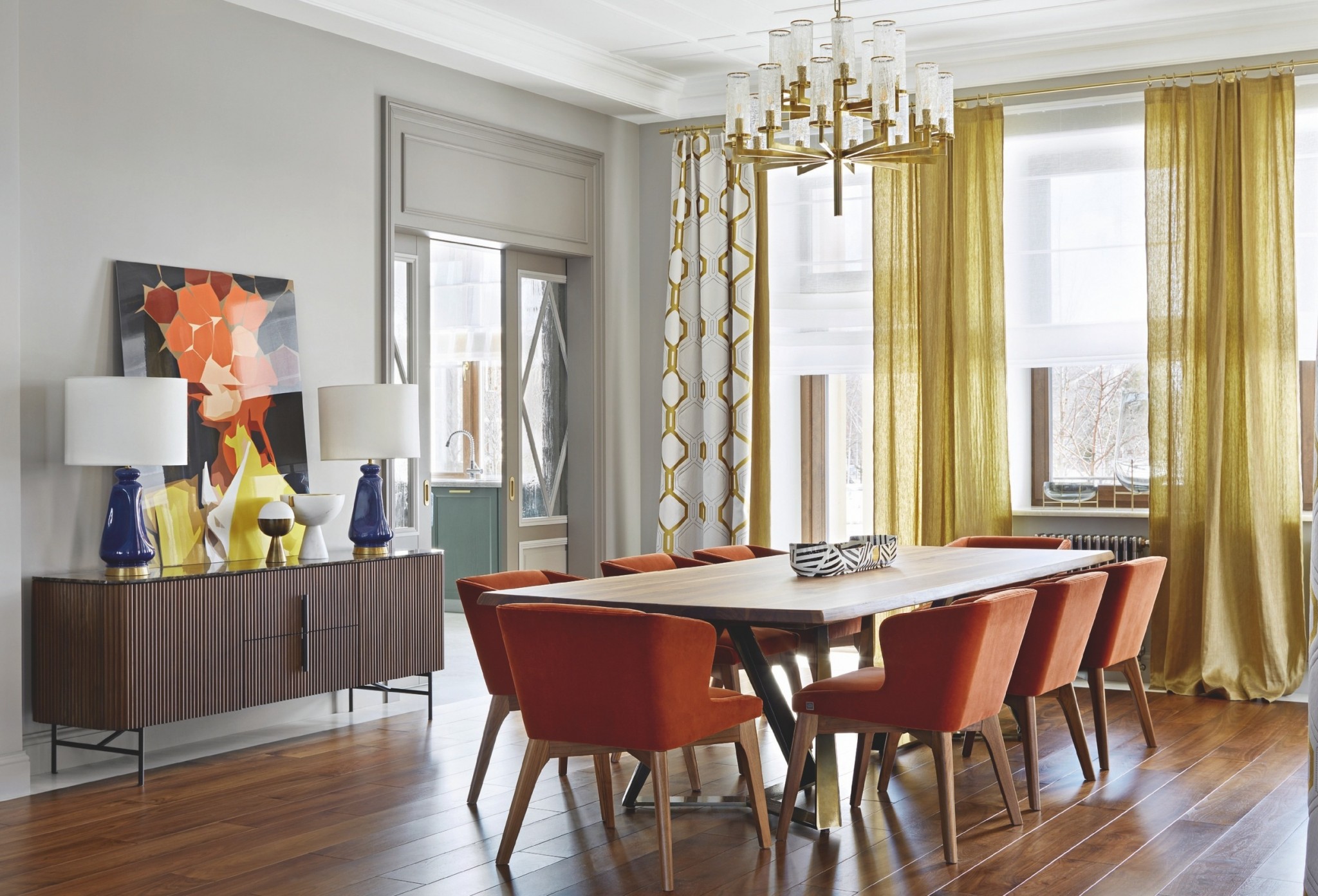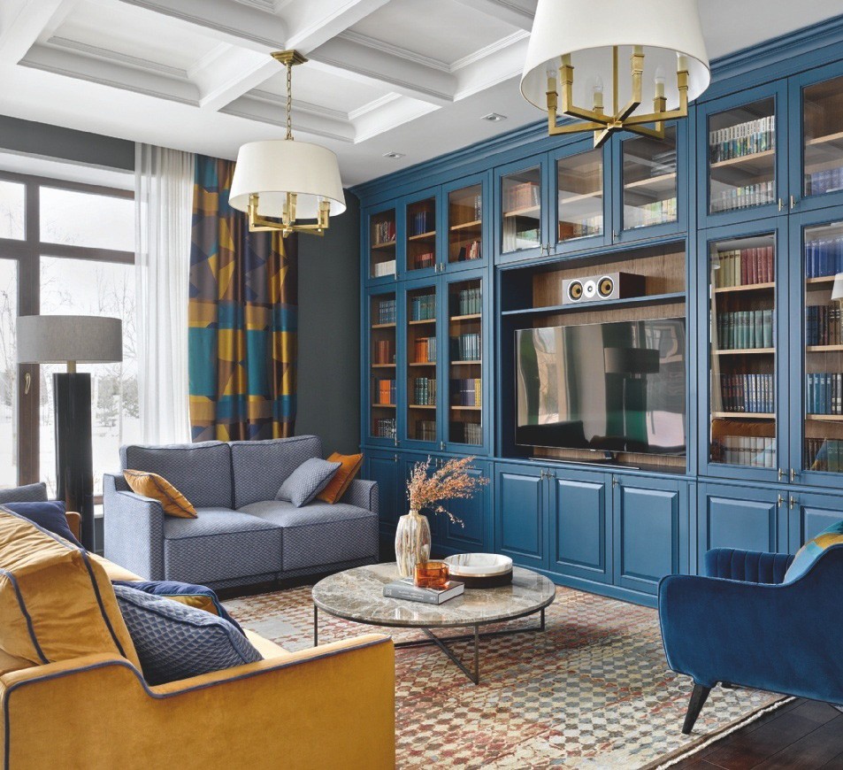Несмотря на спокойную цветовую палитру, в целом интерьер выглядит удивительно тёплым и красочным за счёт декора, предметов искусства, ярких оттенков в обивке и текстиле. «Один из основных моих приёмов — цвет, — продолжает Ксения. — Я всегда его использую, люблю миксовать, сочетать разные оттенки или, наоборот, работать на контрасте. Меня не пугают глубокие, насыщенные цвета, я умею с ними обращаться. Кабинет в этом проекте яркое тому доказательство».