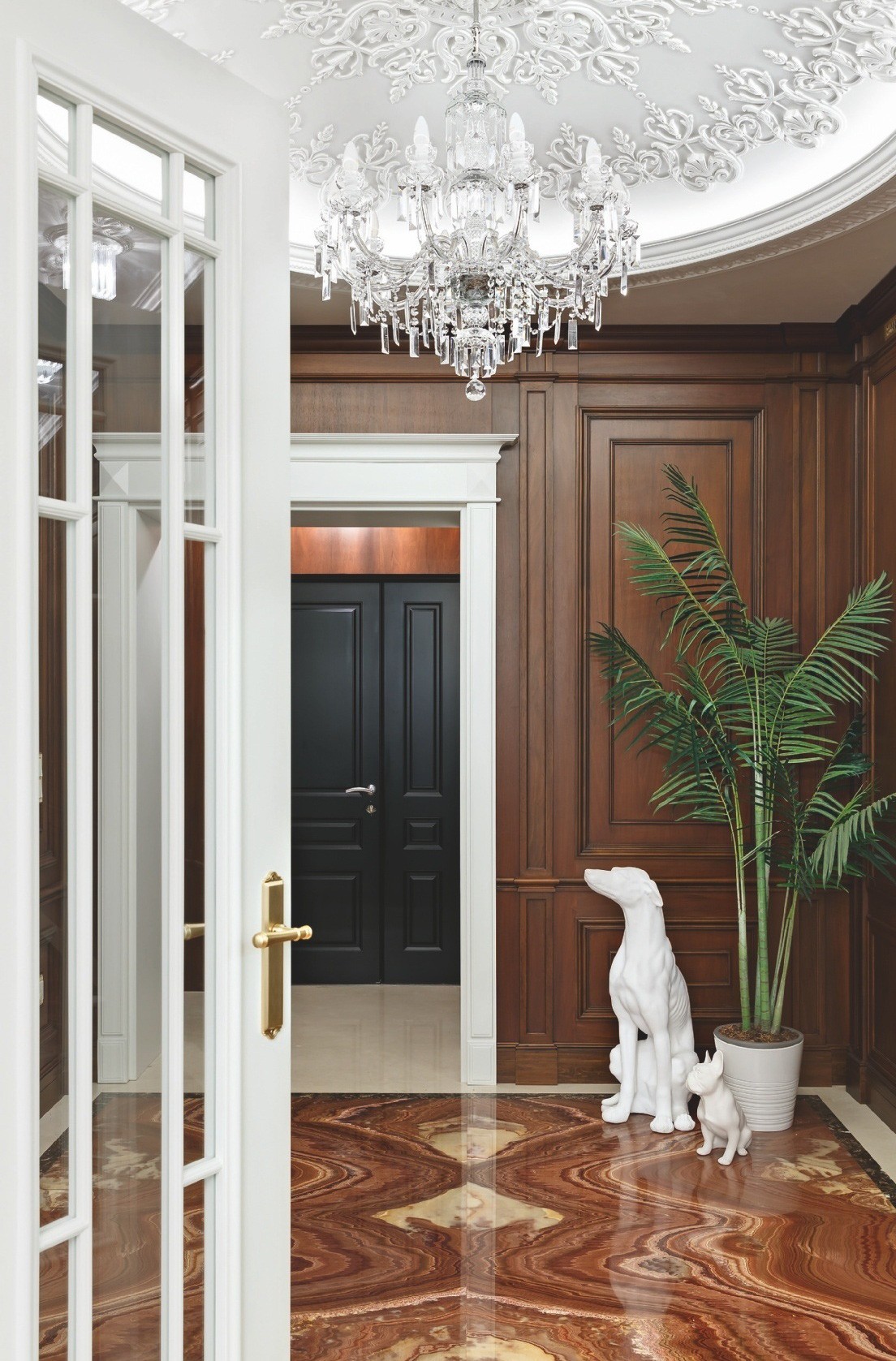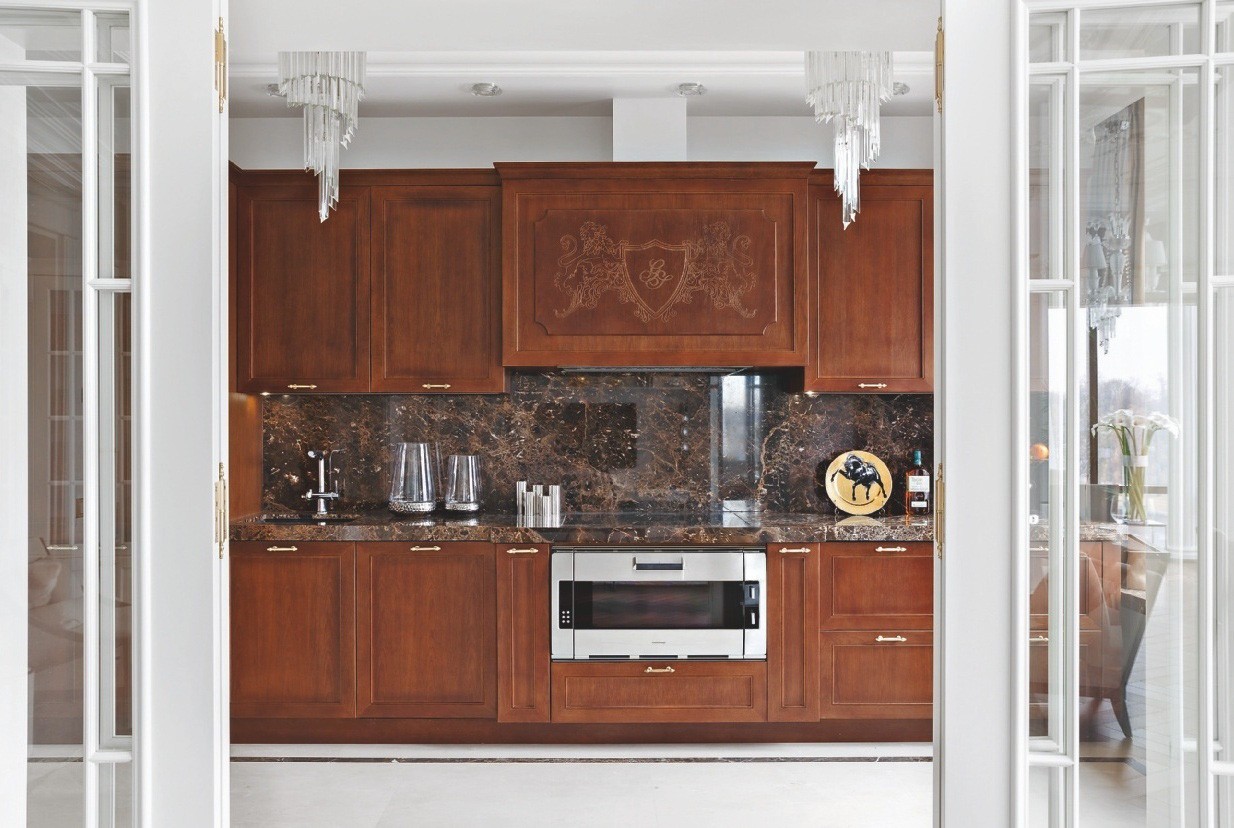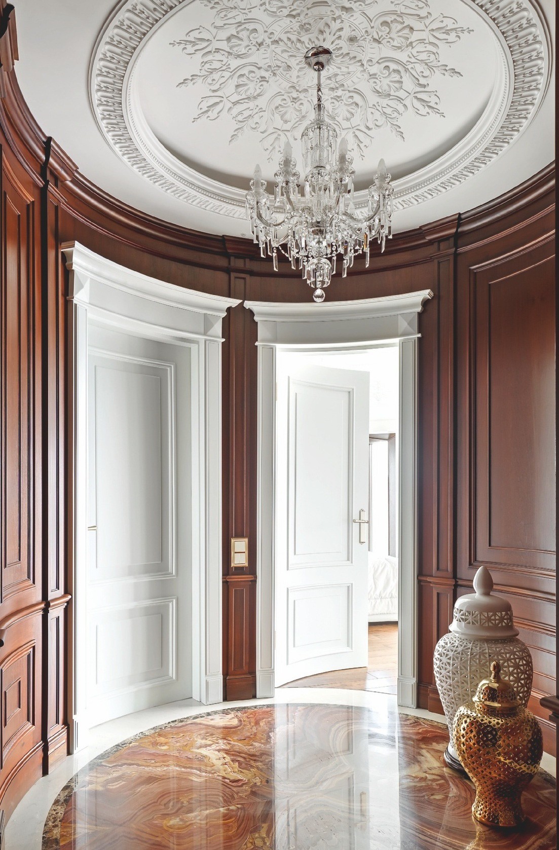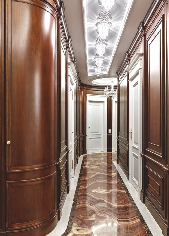 На фоне белоснежных стен и потолков, украшенных лепным декором и хрустальными люстрами, эффектно смотрятся тёмно–коричневая мебель, буазери и полы из древесины ореха. Разрабатывая планировочное решение, дизайнеры обратили внимание на круглую форму здания, из-за чего в спальне некоторые стены имели полукруглую форму. Тему круга продолжили в интерьере: входную зону прихожей и часть коридора оформили радиусными стенами. В поддержку им потолок декорировали двумя куполами с ажурным лепным орнаментом и светодиодной подсветкой, а на пол положили удивительной красоты оникс. С ним связана отдельная история. «Изначально пол предполагали выложить мрамором Siena Brown с тёмной и светлой окантовкой из мрамора Emperador Dark и Crema Marfil, — продолжает рассказ Иван. — Мы вместе с заказчиком объехали практически все крупные склады камня в Санкт–Петербурге и уже остановились на мраморе Siena Brown, как вдруг мне позвонил мой приятель, занимающийся поставками камня, и сообщил, что на склад привезли потрясающий оникс красно–коричневого цвета со светлым волнистым рисунком. Когда мы его увидели, то поняли, что это то, что нам надо. Камень полностью оправдывал своё название — Onice Fantastico. Количества слэбов как раз хватило на весь пол в прихожей и коридоре. Заказчики и мы были в полном восторге!»