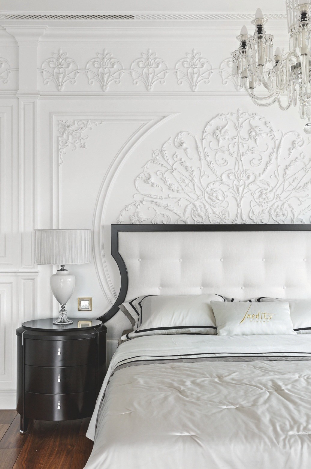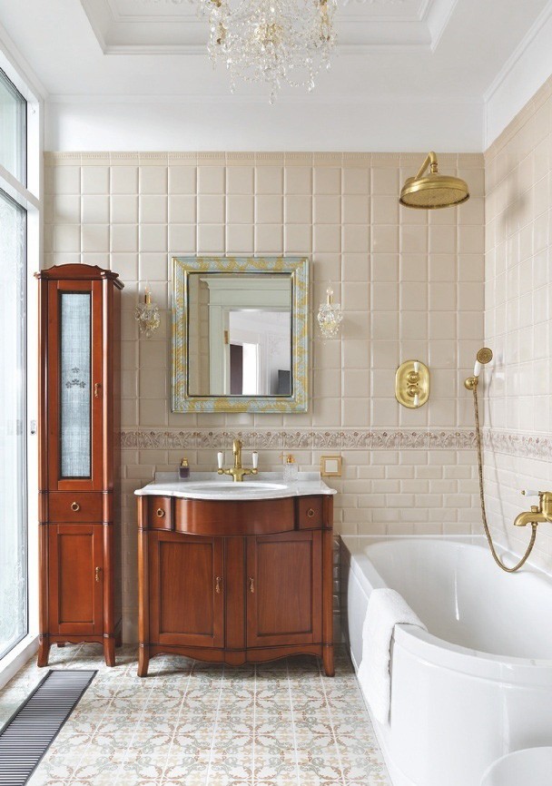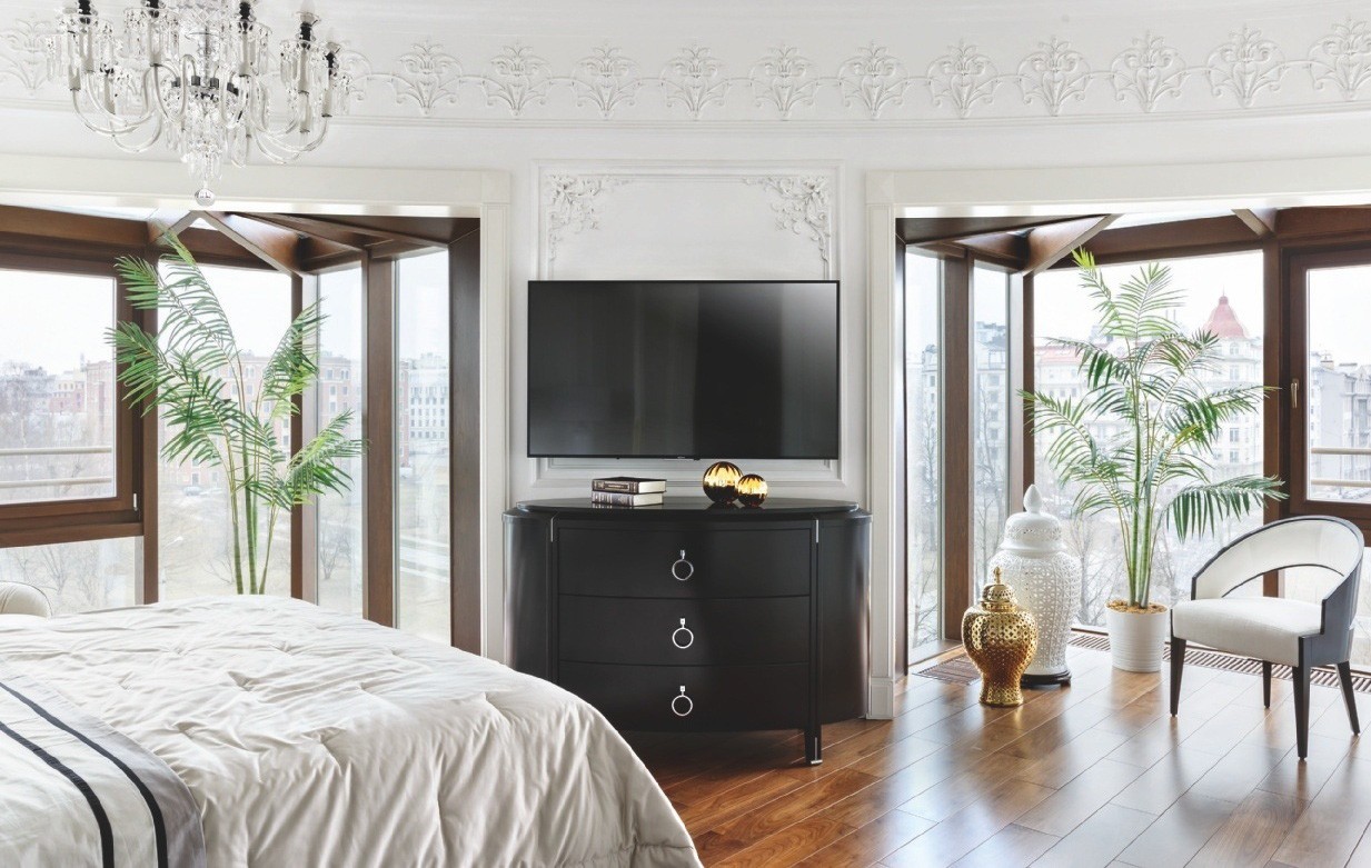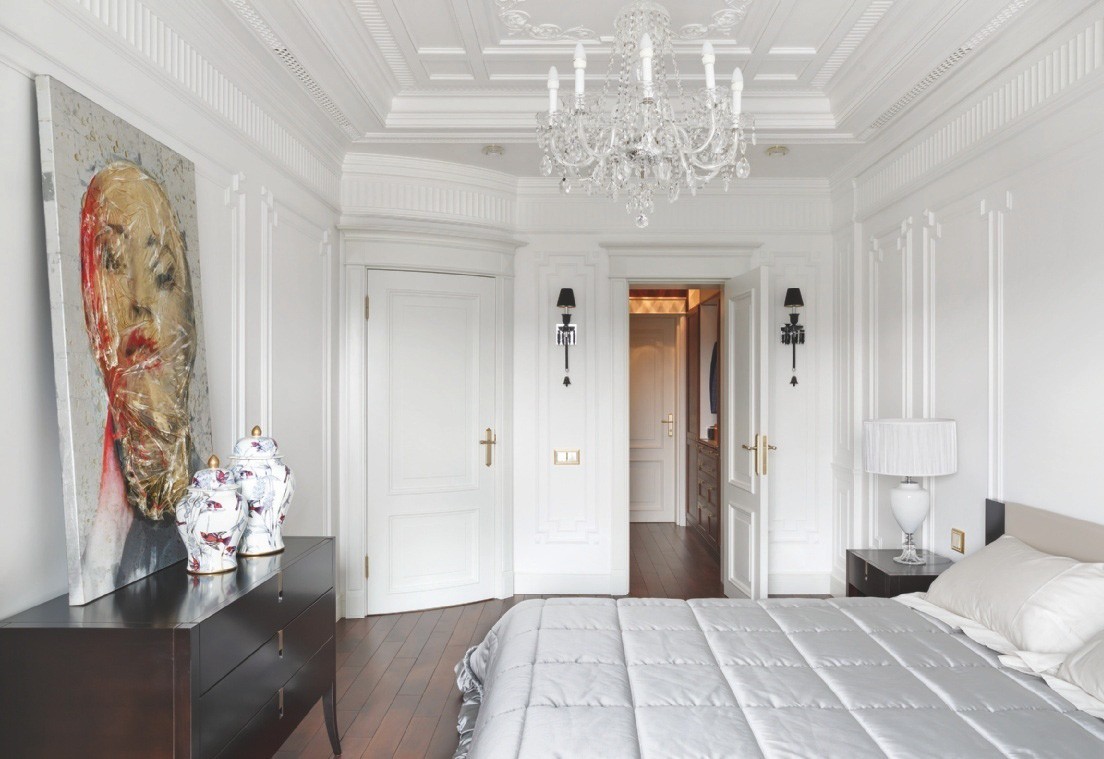 На фоне белоснежных стен и потолков, украшенных лепным декором и хрустальными люстрами, эффектно смотрятся тёмно–коричневая мебель, буазери и полы из древесины ореха. Разрабатывая планировочное решение, дизайнеры обратили внимание на круглую форму здания, из-за чего в спальне некоторые стены имели полукруглую форму. Тему круга продолжили в интерьере: входную зону прихожей и часть коридора оформили радиусными стенами. В поддержку им потолок декорировали двумя куполами с ажурным лепным орнаментом и светодиодной подсветкой, а на пол положили удивительной красоты оникс. С ним связана отдельная история. «Изначально пол предполагали выложить мрамором Siena Brown с тёмной и светлой окантовкой из мрамора Emperador Dark и Crema Marfil, — продолжает рассказ Иван. — Мы вместе с заказчиком объехали практически все крупные склады камня в Санкт–Петербурге и уже остановились на мраморе Siena Brown, как вдруг мне позвонил мой приятель, занимающийся поставками камня, и сообщил, что на склад привезли потрясающий оникс красно–коричневого цвета со светлым волнистым рисунком. Когда мы его увидели, то поняли, что это то, что нам надо. Камень полностью оправдывал своё название — Onice Fantastico. Количества слэбов как раз хватило на весь пол в прихожей и коридоре. Заказчики и мы были в полном восторге!»