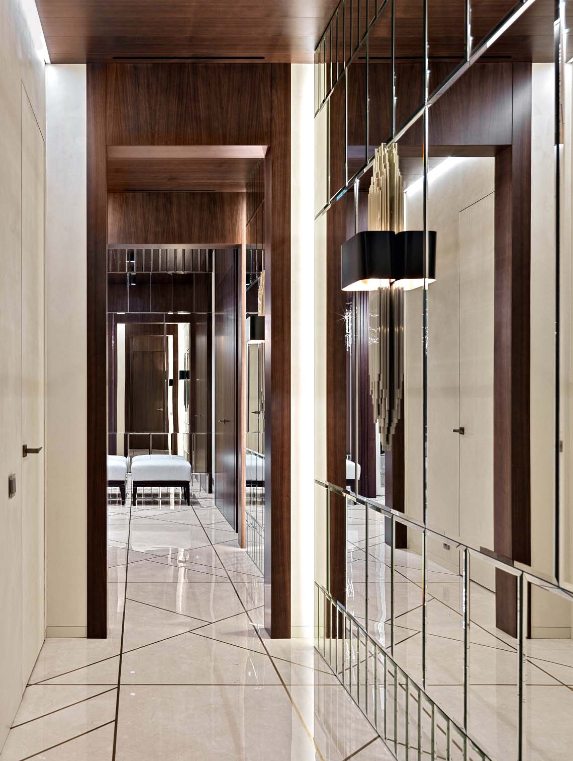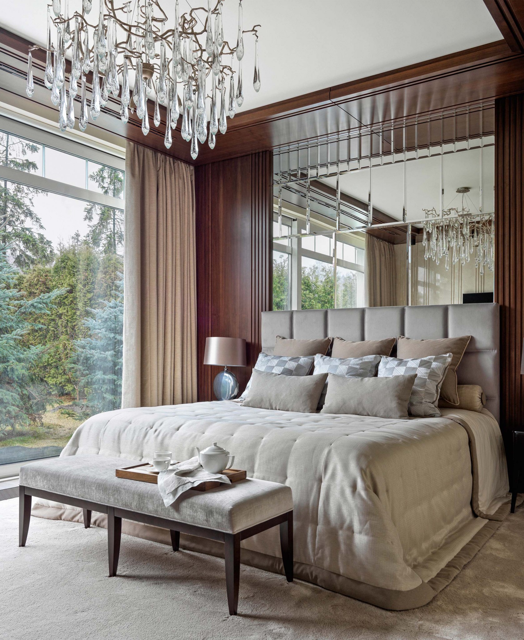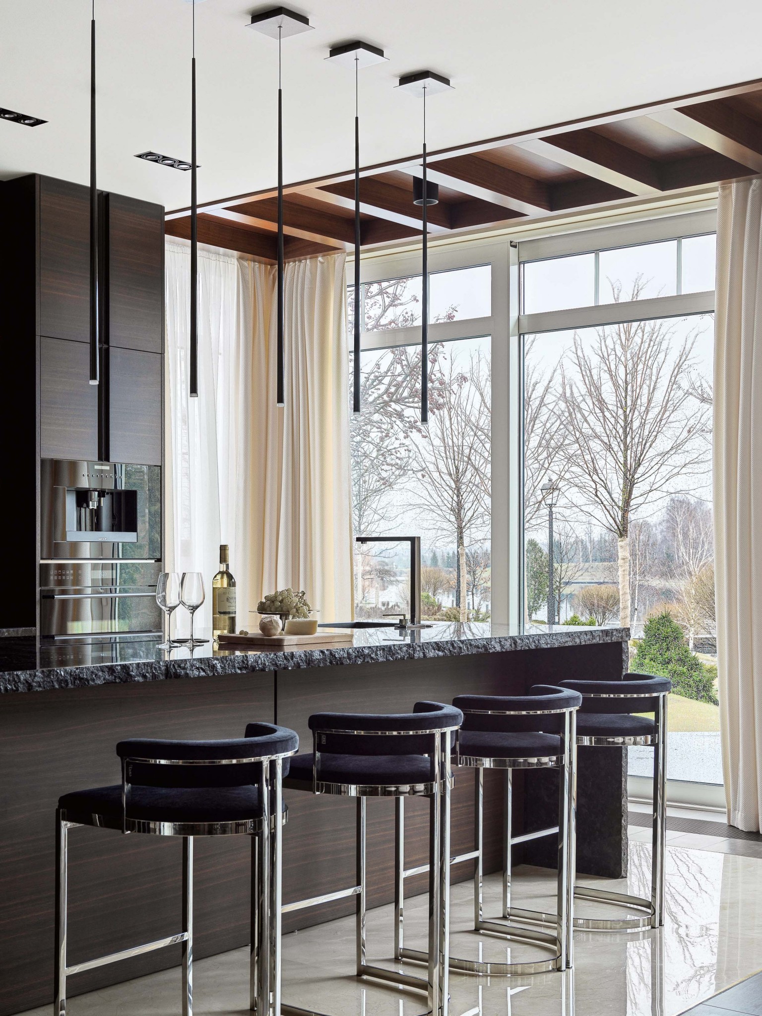 В оформлении использованы дорогие, статусные марки мебели, натуральные, природные материалы и приятные фактуры, которые создают, с одной стороны, атмосферу отдыха, а с другой — динамичную среду для домашних праздников. Пол в гостиной и спальне выложен паркетной доской из тонированного дуба, в холле и коридоре —мрамором с инкрустацией из латуни. Стены декорированы деревянными буазери и рельефными наборными панелями из мрамора, а потолок — деревянными панелями и балками. Пристальное внимание архитектор уделила тактильности предметов. Это мягкие и уютные обивки мебели, ковры, тёплые поверхности дерева, к которым приятно прикасаться. В свою очередь натуральный гранит с колотым краем и холодные гладкие поверхности мрамора привносят в интерьер эффектный контраст. Стилистика пространства в меру современная с налётом лоска и респектабельности выбрана не случайно, ведь по заданию заказчика гостевой дом должен был стать логическим продолжением основного дома как во внешнем облике, так и во внутреннем. «У хозяев довольно часто бывают гости: партнёры по бизнесу, медийные личности,— замечает Елена.— Шумные и весёлые застолья могут помешать маленьким детям, поэтому заказчик решил создать отдельное пространство, позволяющее отдыхать и детям, и взрослым, не мешая друг другу. Даже несмотря на некую функциональную легкомысленность дома, мы старались сделать всё, чтобы интерьер соответствовал статусу хозяев».