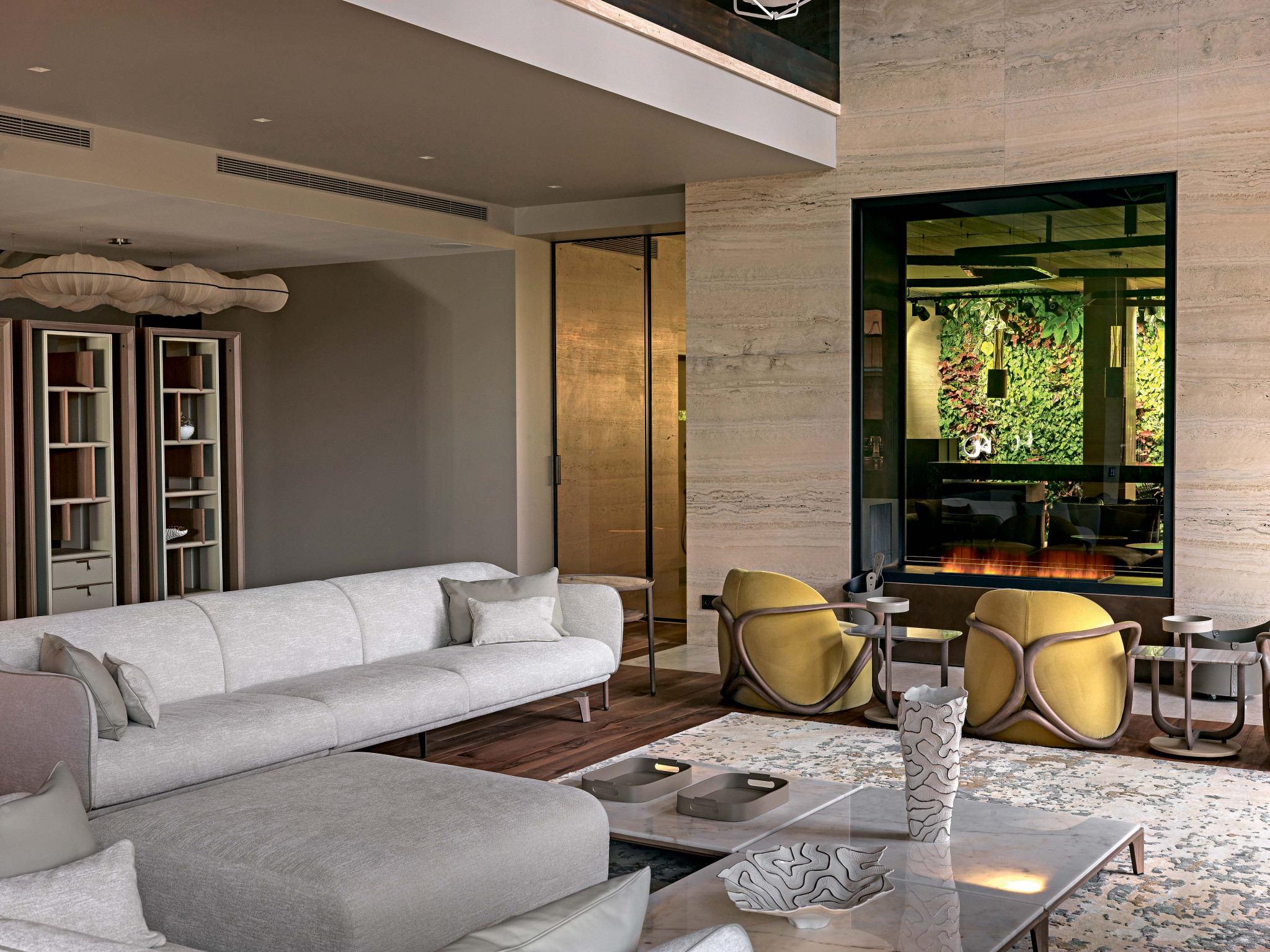 Центром дома и точкой притяжения стал двусторонний камин с большим стеклянным проёмом. Одной стороной он обращён к гостиной, второй — к спортивной лаунж-зоне, которая хорошо просматривается из «парадной» половины дома и так же обстоятельно оформлена. Занимаясь спортом или отдыхая в гостиной, можно не терять друг друга из виду. В таком дуализме и проявился персональный подход к интерьеру, задуманному под конкретный образ жизни семьи. Мощным объединяющим мотивом стал выбор отделочных материалов и цветовой палитры. Одним из основных материалов отделки дома был выбран травертин Navona в спокойной бело–бежевый гамме и с интересной фактурой, в которой есть естественные каверны, придающие материалу живость и подчёркивающие его природное начало. Вторым по значимости материалом стало дерево. Массив американского ореха особого распила с выраженной фактурой лёг в основу единого пространства гостиной-кухни-столовой. Своей натуральной пестротой он разбил монотонность большой