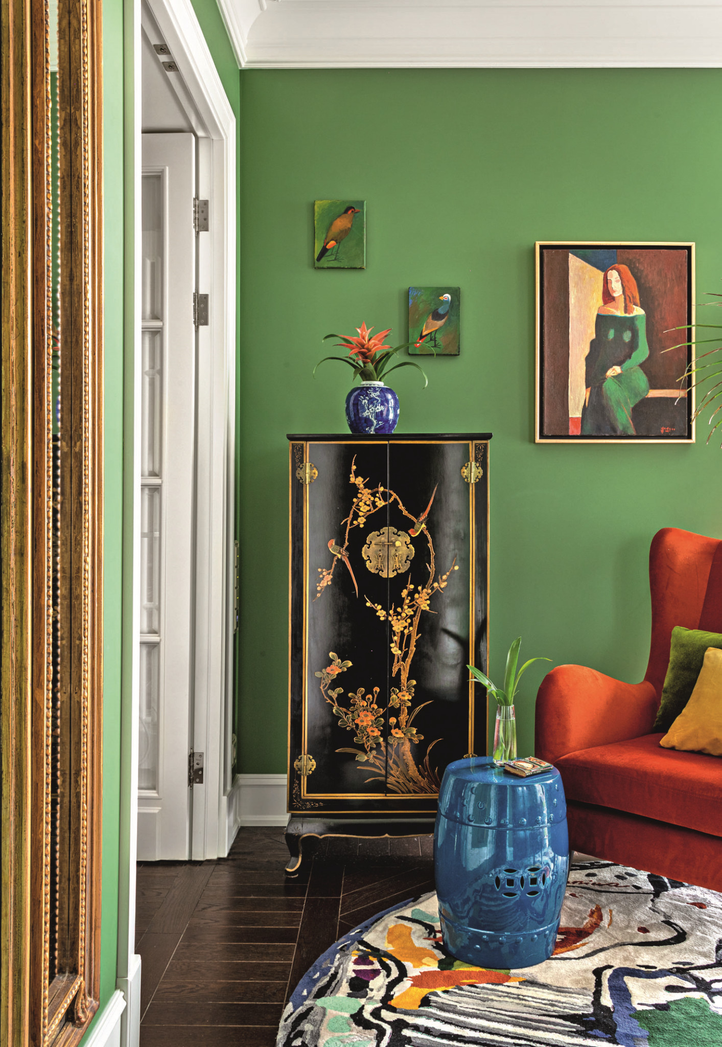 И если архитектура квартиры изначально не вполне соответствовала такому принципу, то это удалось исправить — правильной планировкой, подбором и расстановкой мебели, созданием визуальной структуры стен, предметами и декором, иногда молдингами, выбором правильного масштаба предметов мебели, светильников, аксессуаров. Кроме того, дизайнер использовала принцип симметрии — один из основополагающих приемов классики, а стиль интерьера задумали именно как современную классику с элементами шинуазри. Он предоставил богатые инструментальные возможности для воплощения в интерьере идеи «райского сада» — это цветы и птицы на расписанных вручную обоях, витрина в виде стилизованной пагоды, бело-синий китайский фарфор. Может показаться, что цветовая палитра тоже из арсенала шинуазри, но на самом деле все еще интереснее: дизайнер в самом начале обратила внимание на цвет нарядов владелицы квартиры и то, как они сочетаются с ее внешностью — цветом глаз и волос. Так возникло комфортное для хозяйки сочетание терракотово-рыжего с оттенками зеленого, синего, фиолетового, желтого, бежевого с зеленоватым подтоном и белого, эта палитра подчеркивает и усиливает природную красоту девушки.